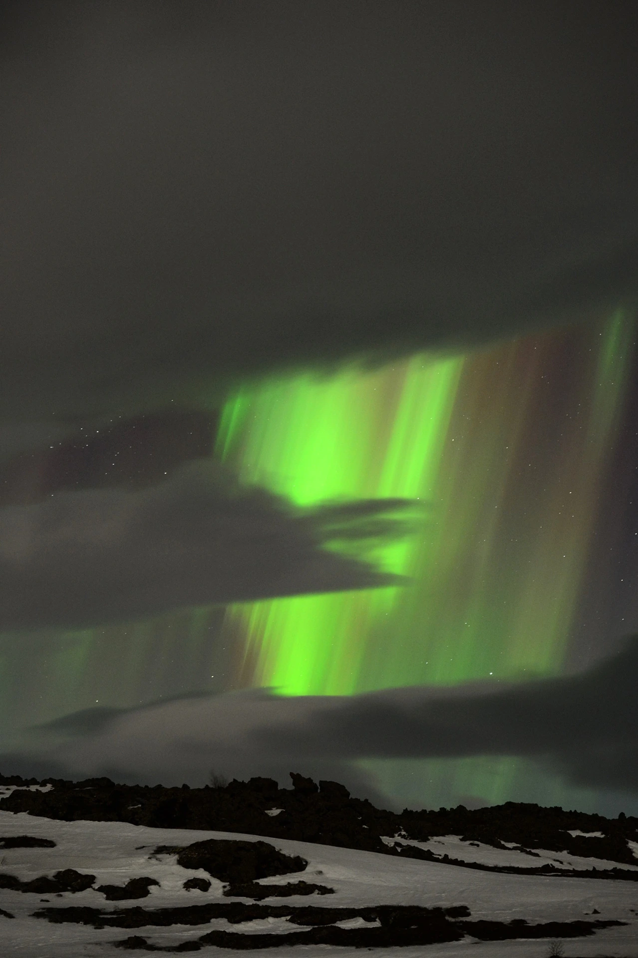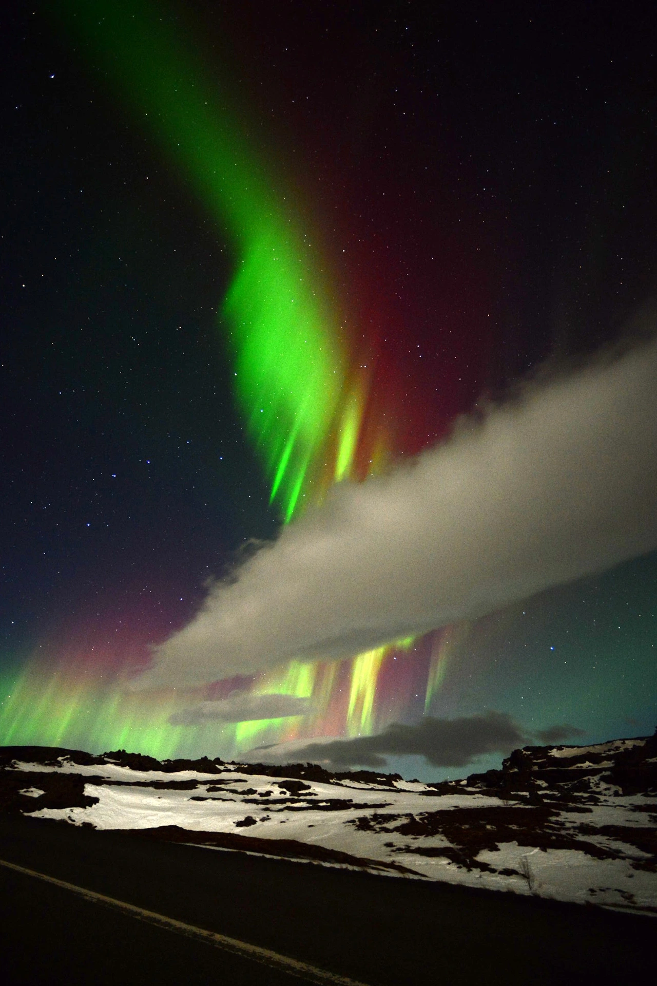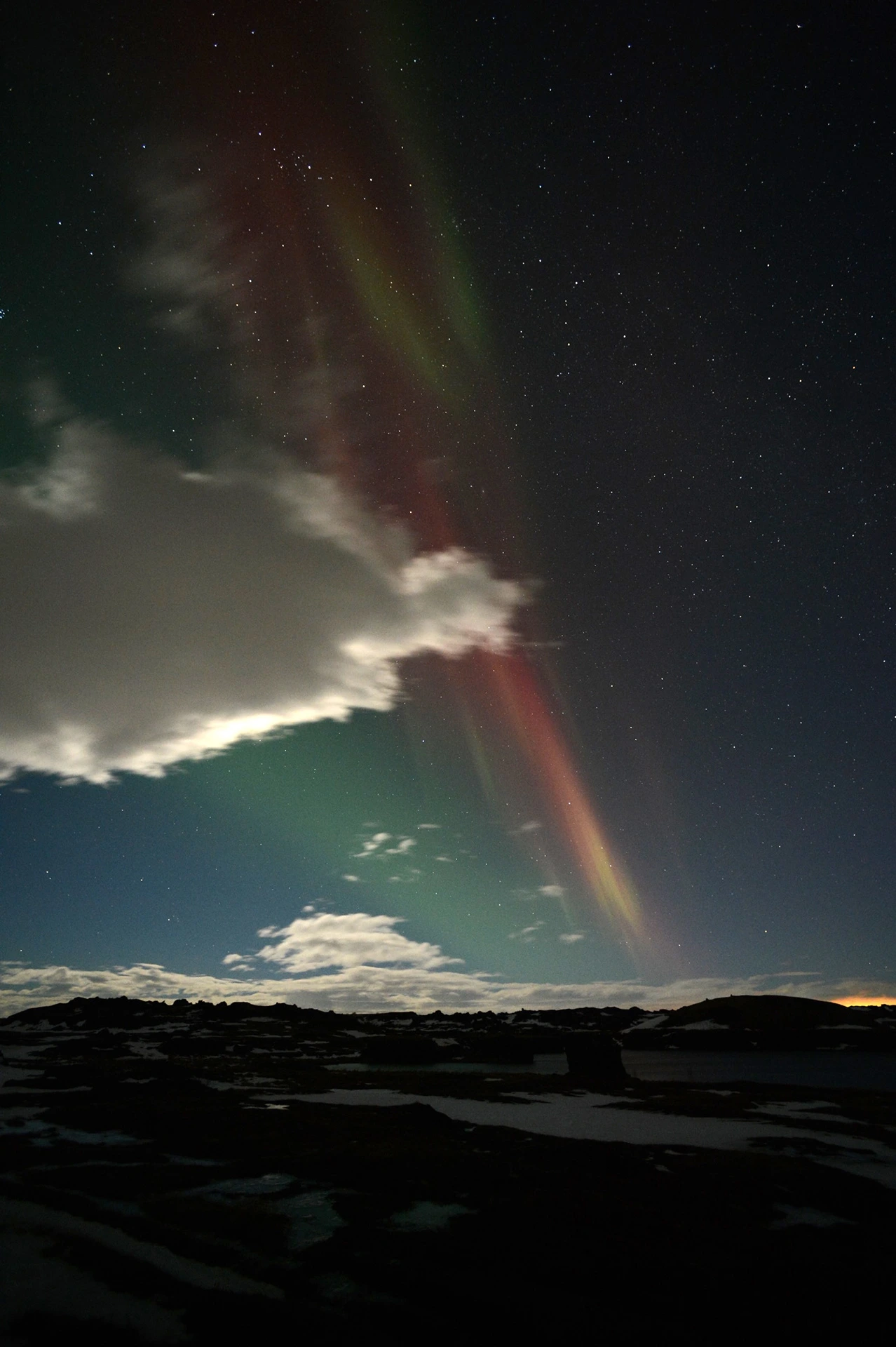 호수와 어우러진 오로라의 풍경을 담기 위해 수 km 떨어진 곳에 있던 가 있던 J가 고대하던 붉은 오로라가 나타났다며 내게 문자를 보냈다. 붉은 오로라는 녹색의 오로라 위에 나타나는 것으로, 색깔이 연해서 보통 때는 보기가 어려운 희귀한 오로라다.