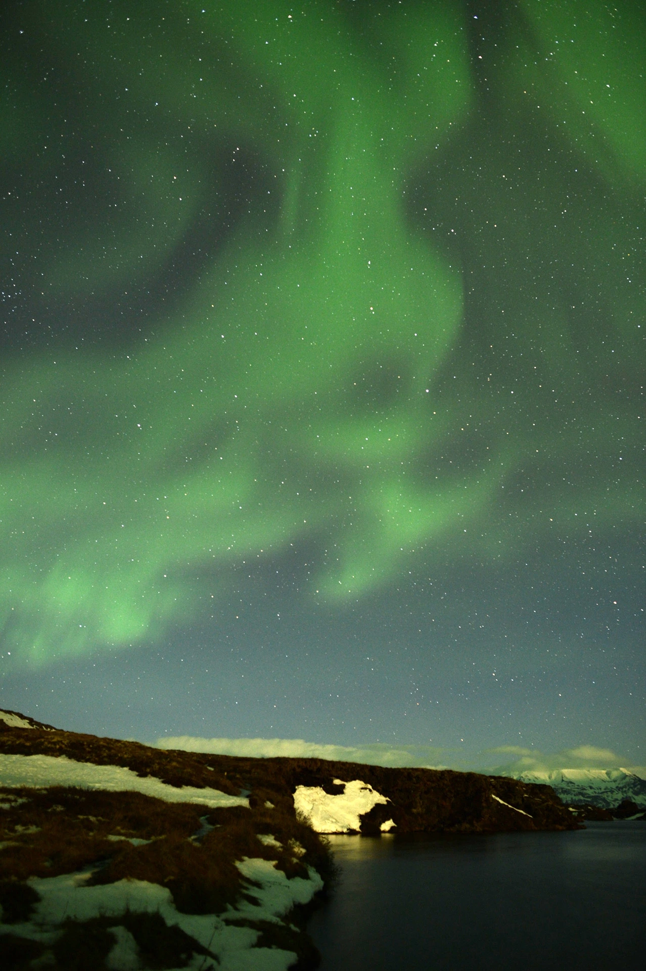 나는 "어차피 오로라는 하늘에 있는데, 호숫가에서 보는 오로라나 호텔에서 보는 오로라나 다 그게 그거 아냐?" 하면서 그냥 숙소에 남아 오로라를 보기로 했다. 호수 건너 서쪽 지평선에서 동쪽 지평선까지 머리띠 모양의 오로라가 둥근 호를 그리며 연둣빛 다리를 놓았다. 오로라 오벌 아래에서는 오로라가 동쪽과 서쪽을 이으면서 나타난다, 처음엔 강력한 한 줄 띠로 시작해서 고운 두 줄, 그러더니 미세한 갈래로 갈라지면서 한밤중 몇 시간 동안 오로라 다리는 끊어지지 않았다. 북쪽으로 창을 낸 내 방에서도 오로라가 보였다. 창을 통해서 바라보는 오로라는 창문에 드리워진 커튼과도 같았다.