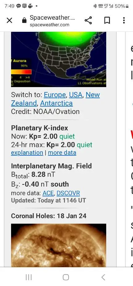 이제 오로라 보는 일만 남았다고 생각하며 인터넷에서 오로라 관측에 관해 가장 권위가 있는 스페이스웨더닷컴 (www.spaceweather.com)에 꾸준히 들어가 봤다. 그 사이트에서는 그날의 Kp 지수와 태양 흑점 활동 상태를 확인할 수 있다.
