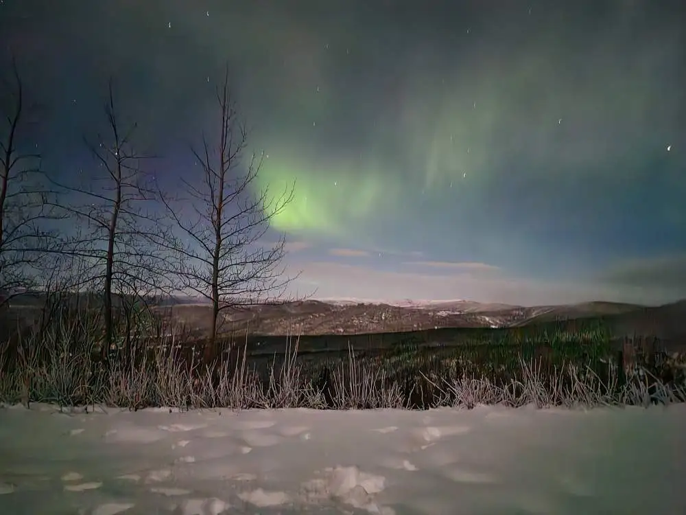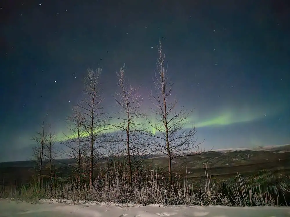 비록 강렬하지는 않았지만 아련하고 부드럽게, 살포시 왔다가 사라지는 오로라. 가느다란 나무 사이로 춤추듯 오가는 그 빛은 희미하지만 존재감은 충분했다.