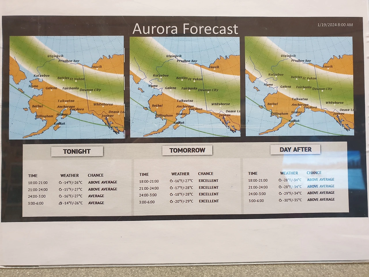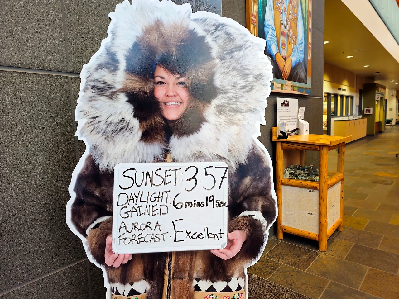 모리스 톰슨 센터는 기대 이상이었다. 알래스카의 자연사를 전시해 놓은 전시장도 수준급이었지만 제일 좋았던 건 오로라 예보. 들어서자마자 오로라 안내판이 서 있고 바로 옆에는 사흘간의 오로라 예보가 지도와 함께 나와 있다.