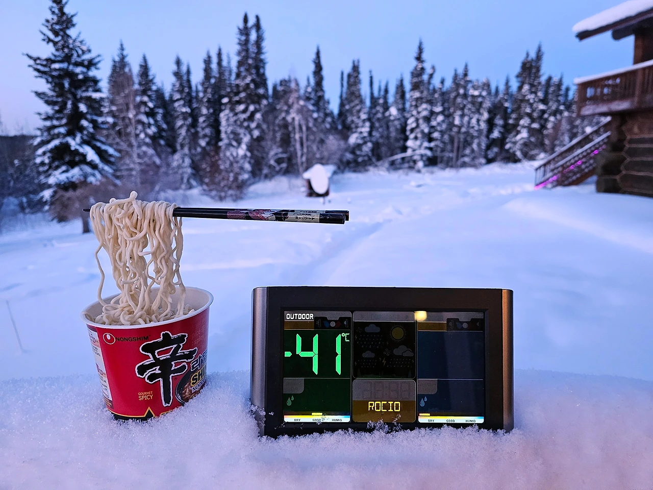 한가한 낮에는 숙소에서 ’북극 놀이‘를 했다. 외부 기온은 영하 41도. 먹던 컵라면을 들고 바깥에 나가 젓가락으로 라면 국수를 들어 올리면 바로 얼어버리기 때문에 불과 몇 초 만에 젓가락을 허공에 떠있게 하는 신공을 벌일 수 있다.