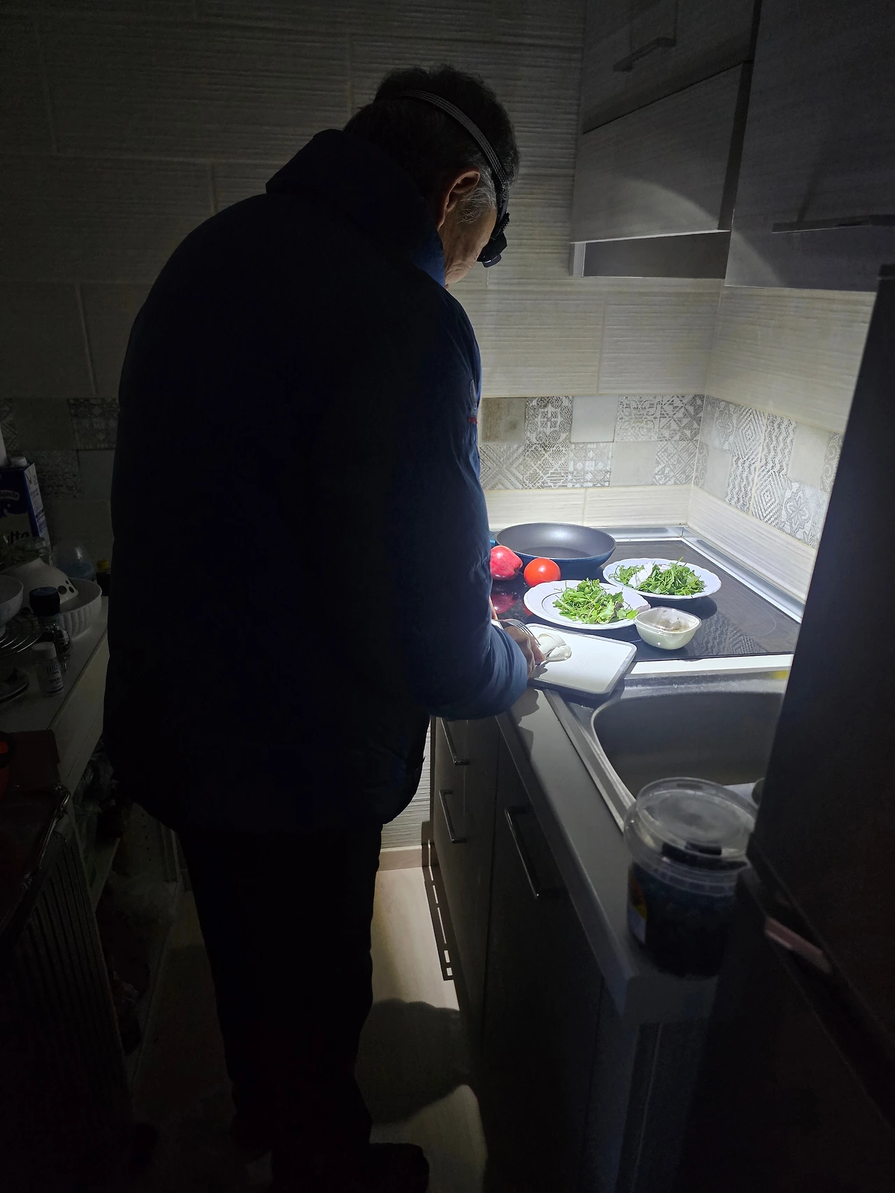 두툼한 파카를 입은 채 헤드 랜턴을 켜고 J가 아침을 준비한다.