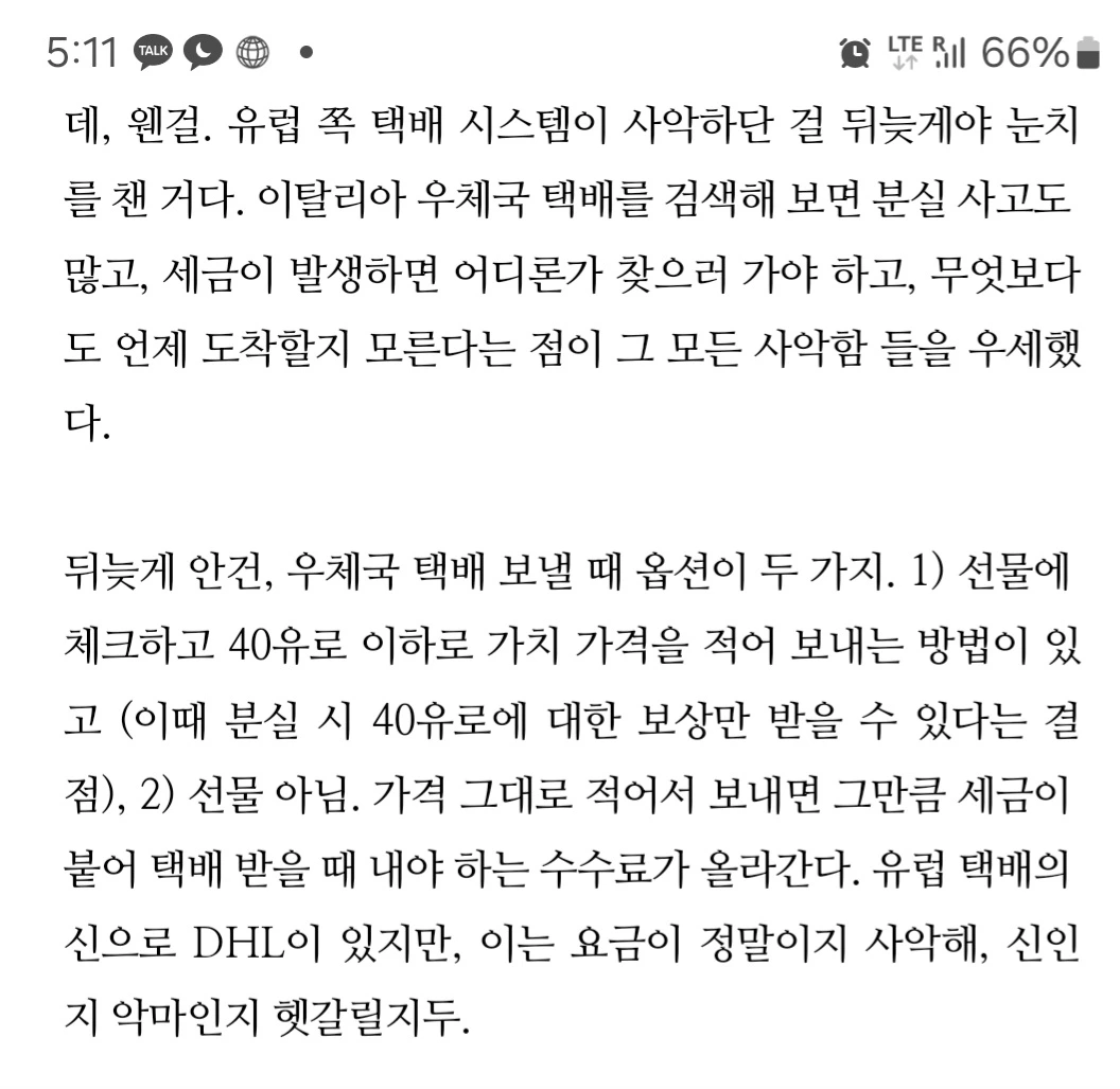 "우리가 있는 건 앞으로도 한 달 넘는데 이탈리아 배송이 최악이래. 위의 글 읽어보라고. 배송비 문제가 아니라 분실, 세금 폭탄이 문제."