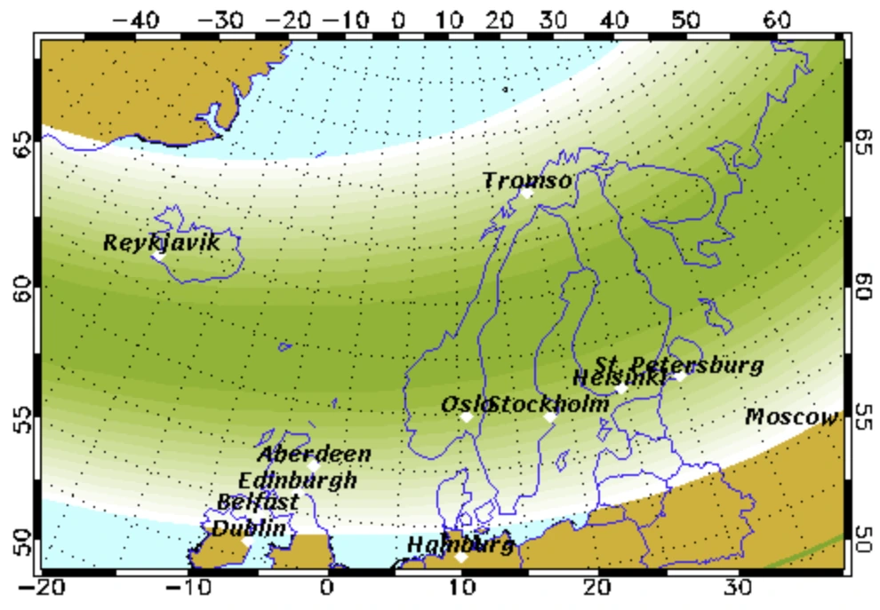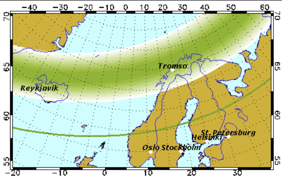 Kp7일 때는 스톡홀름, 오슬로에서도 오로라를 볼 수 있지만,