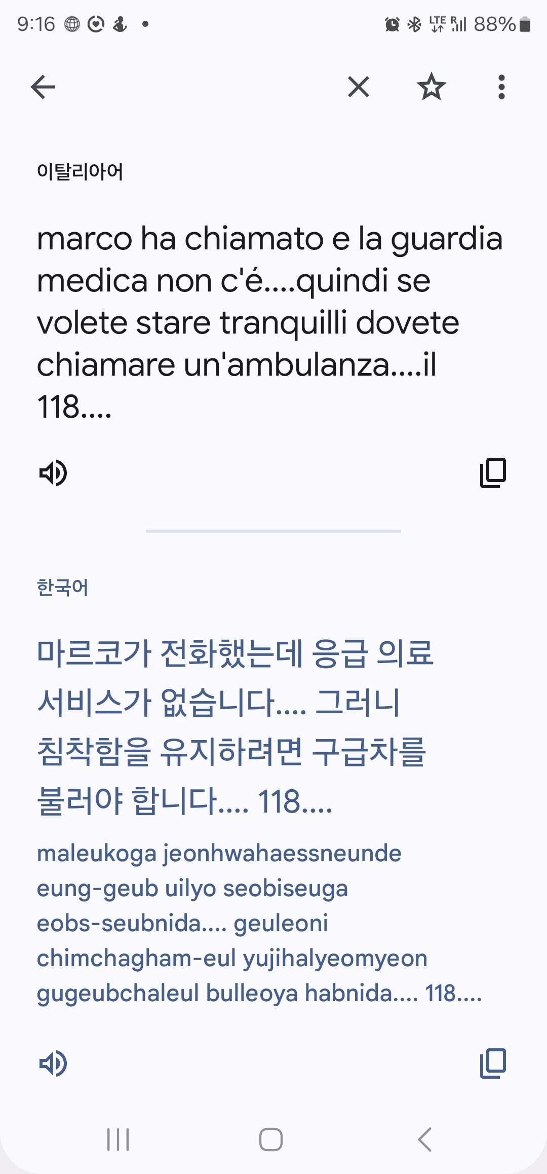 "지금 마르코가 우리 동네의 응급 의료 서비스에 전화하고 있는 중. 피우지에는 병원이 없고 여기서 차로 20분 거리의 알라트리에 마을에만 병원이 있어"