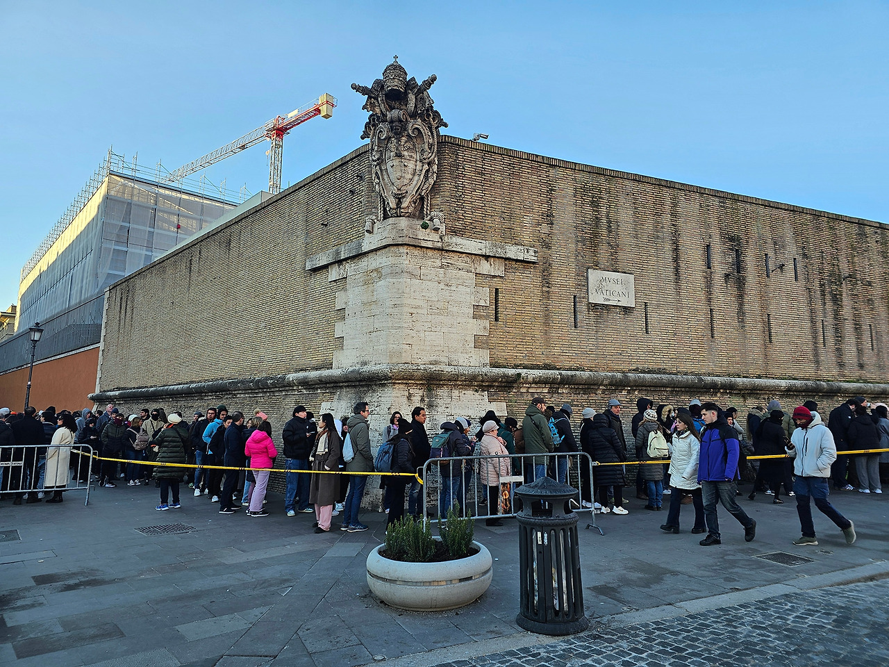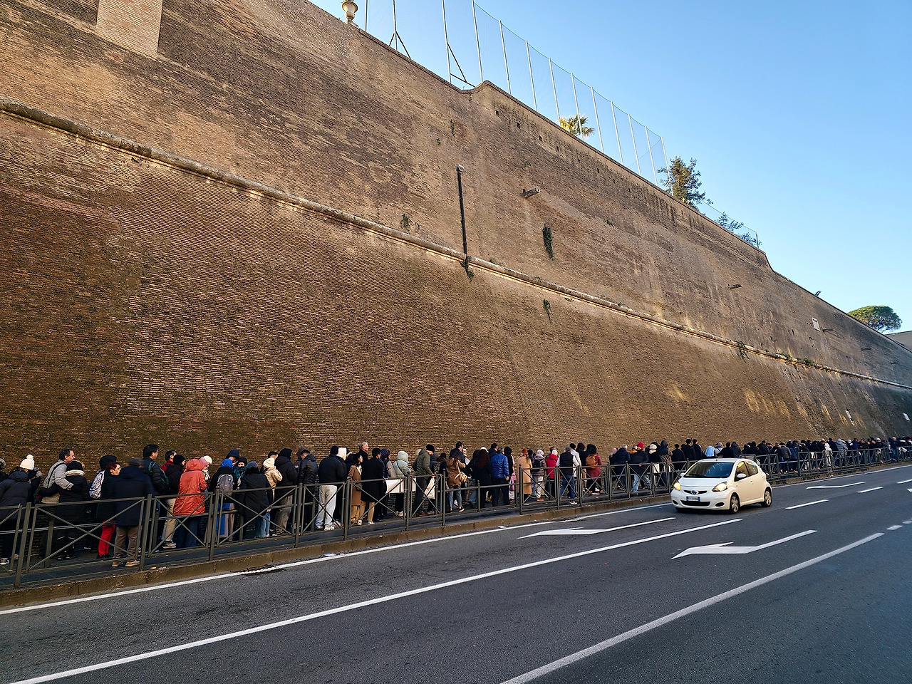 5분쯤 걸었나? 바티칸 성벽이 보이면서 줄이 끝 간 데 없이 이어진다. 수백 미터를 바삐 걸어 다행히 성벽을 따라 이어지는 줄 끝자락에 붙었다.