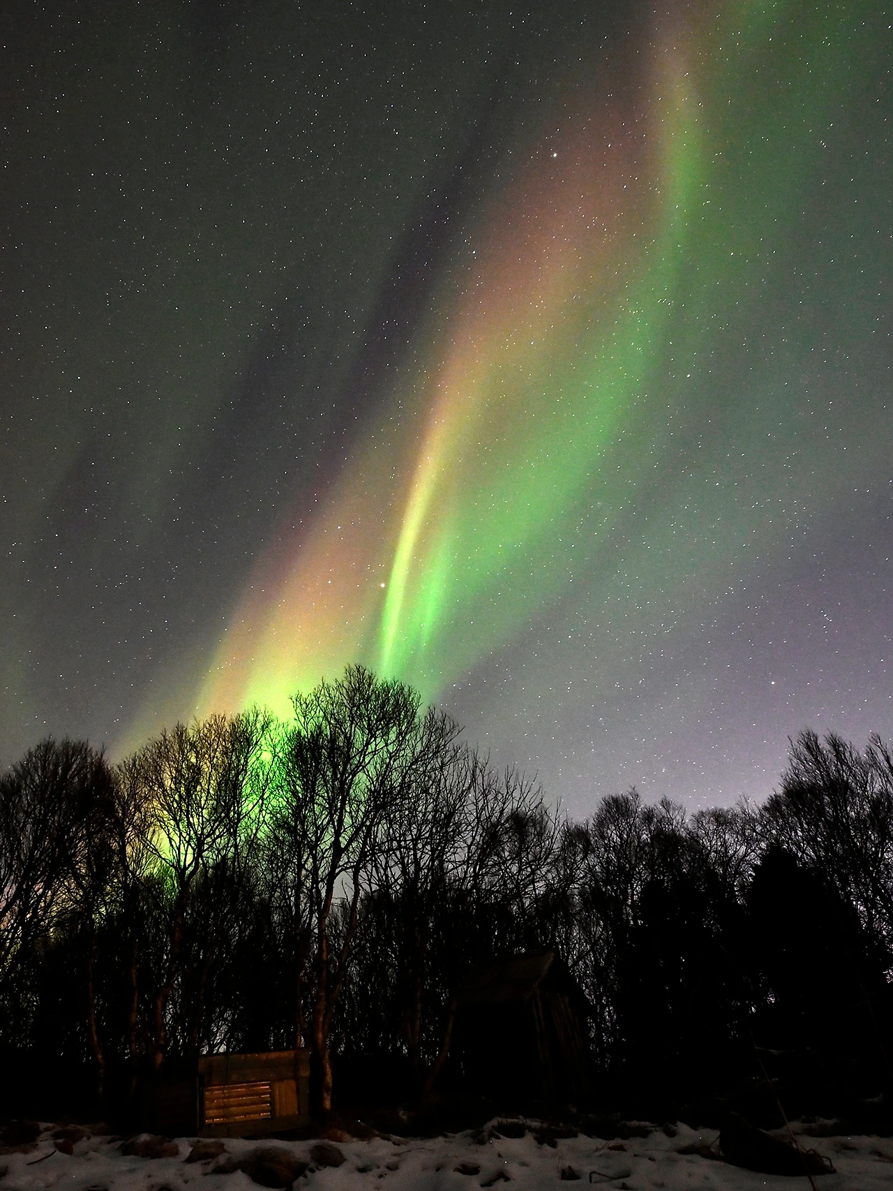 자세히 보면 칼처럼 날카로운 모양도 보이고 전체적으로 동에서 북쪽 하늘을 거쳐 서쪽까지 완전히 펼쳐졌지만 강도가 그리 센 편은 아니다. 그래도 붉은빛이 섞여 있어 평소와 다른 모습을 볼 수 있어 좋았다.