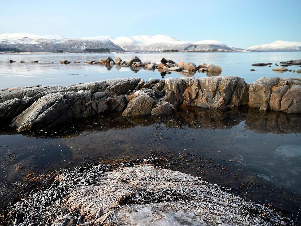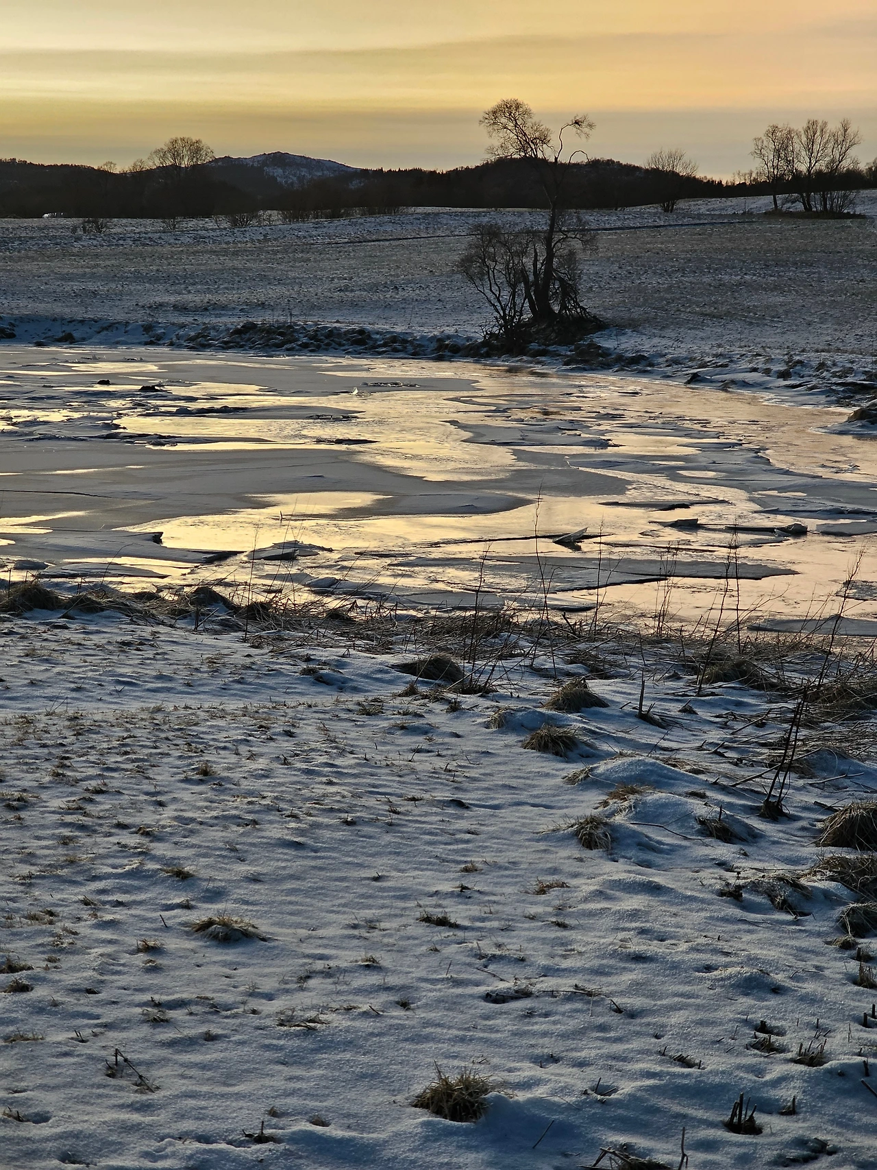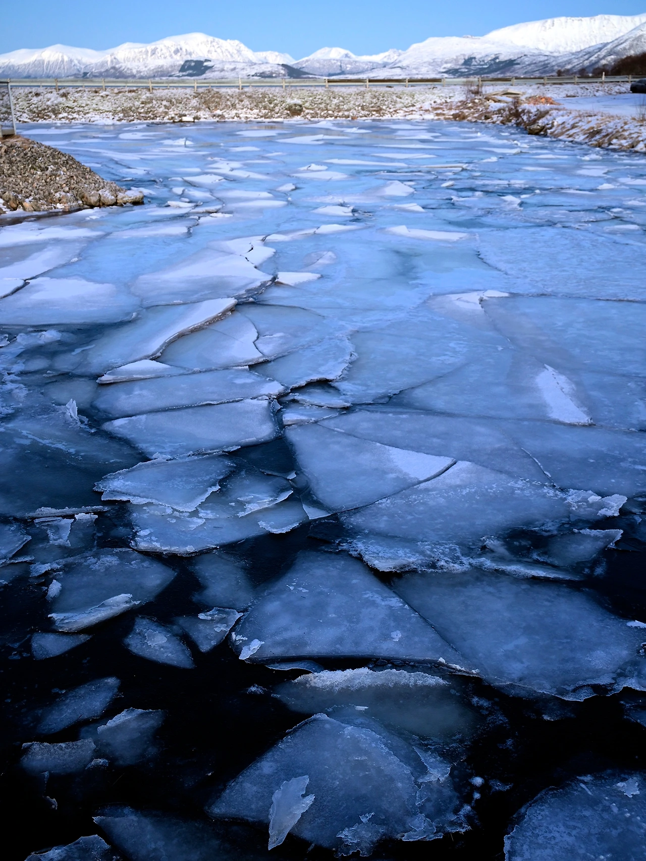 오후에는 소트란드 주변에서 밤중에 오로라 관측을 하기에 적당한 사이트를 답사하고 바닷가 길도 산책했다. 해가 떨어지고 나면 날은 추워지지만 그래봐야 영하 2도, 걷기에 나쁘지 않은 온도다. 아름다운 황혼 속에 눈이 반사되어 은색으로 빛나는 마을 길을 걸으며 극북의 풍경에서 만나게 되는 파스텔톤의 아름다움을 만끽했다. 지나가는 길에 만난 냇물도 예사로운 개천이 아니라 유빙이 둥둥 떠다니는 북빙해의 모습을 닮은 얼음 하천이다.