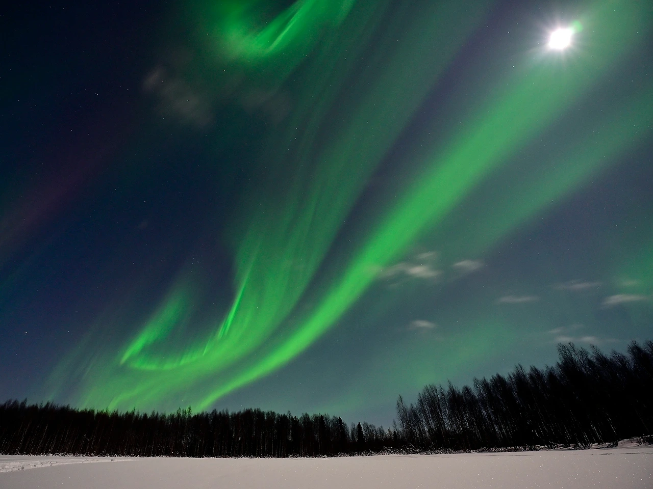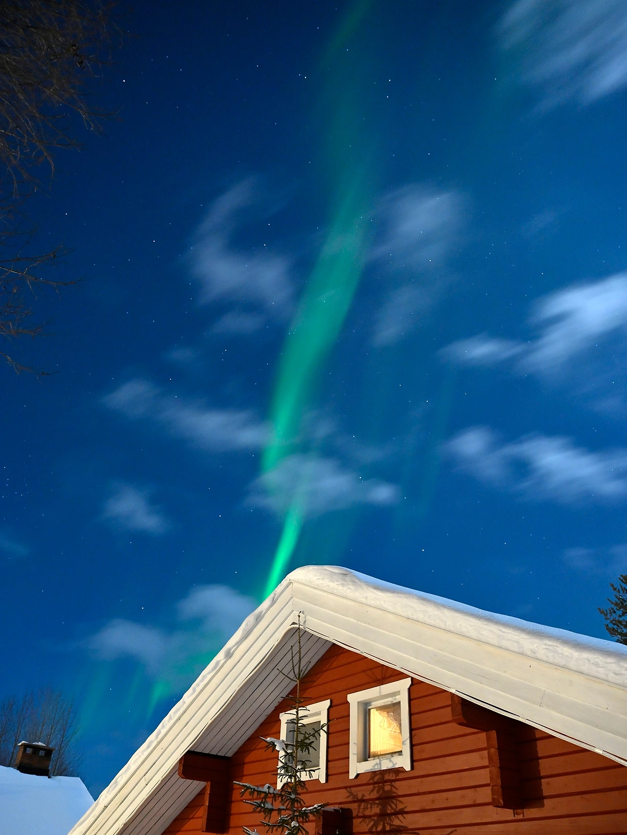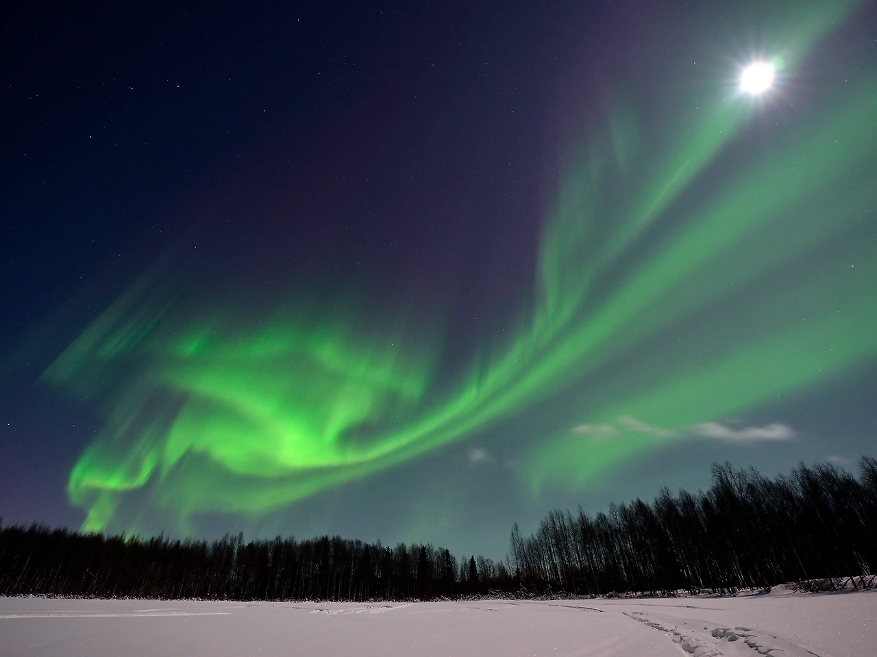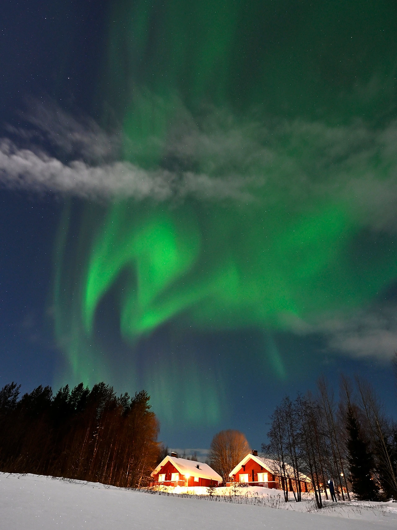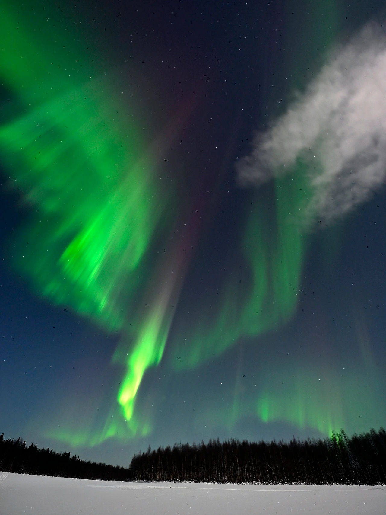 구름과 어우러져 흐릿하게 번지는 오로라도, 숙소 뒤에 솟아오르는 오로라도, 전나무숲 위에 떠오른 오로라도 제각각 다른 운치를 자아내고 있다. 사진으로 담아내면 보름달빛이 눈에 반사되어, 마치 대낮에 오로라가 뜬 것처럼 밝게 보인다.