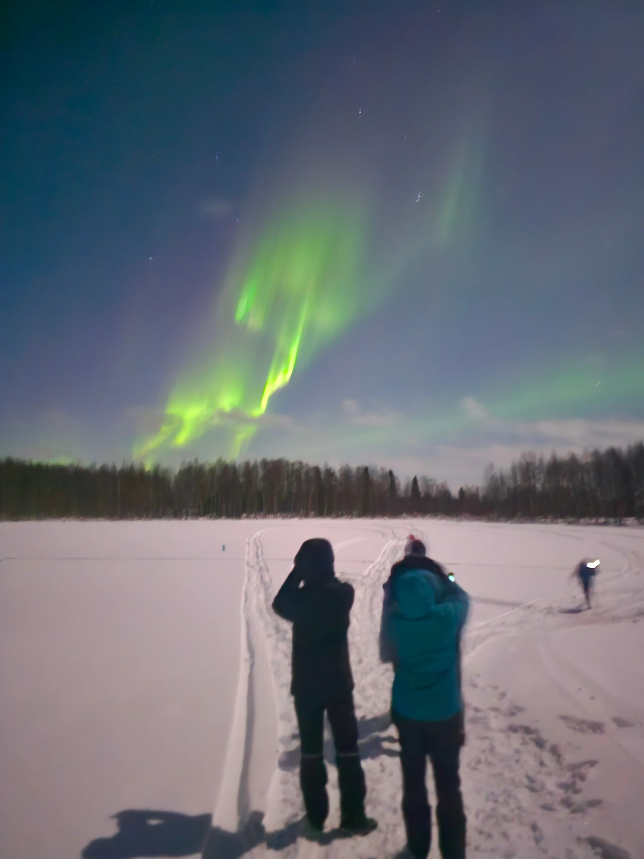 그때 숙소 문을 두드리는 소리, 직원이 '오로라가 떴다'고 알려준다. 밖으로 나가자 머리 꼭대기에 오로라가 펼쳐져 있다. 서둘러 옷을 갖춰 입고 사방이 탁 트인 숙소 앞 눈에 덮인 호수로 나갔다. 이곳에 묵고 있는 모든 게스트들이 호수에 나와 있다. 스위스 커플도, 터키 부부도 오로라를 배경으로 기념사진을 찍으며 신이 났다.