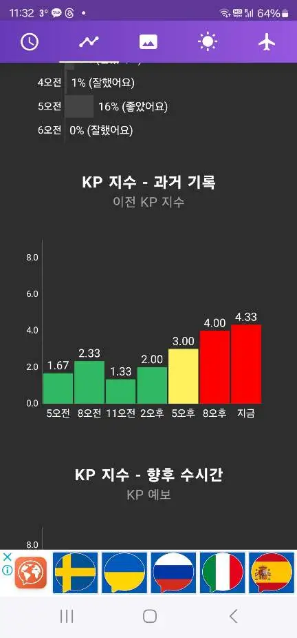 Kp지수의 변화는 참으로 흥미롭다. 나는 처음에 한 번 발표된 지수는 하루종일 그대로 유지되는 줄 알았다. 그러나 계속 관찰해보니 불과 몇 시간, 몇십 분 사이에도 지수가 순식간에 솟아올랐다가 곤두박질치며 요동치는 경우가 많았다. 이날 오전 11시에 1.33에 불과하던 지수는 등락을 거듭하면서 상승세를 타다가, 최고 4.67까지 오르며 로바니에미 일대 하늘에 장대한 오로라를 드리웠다.