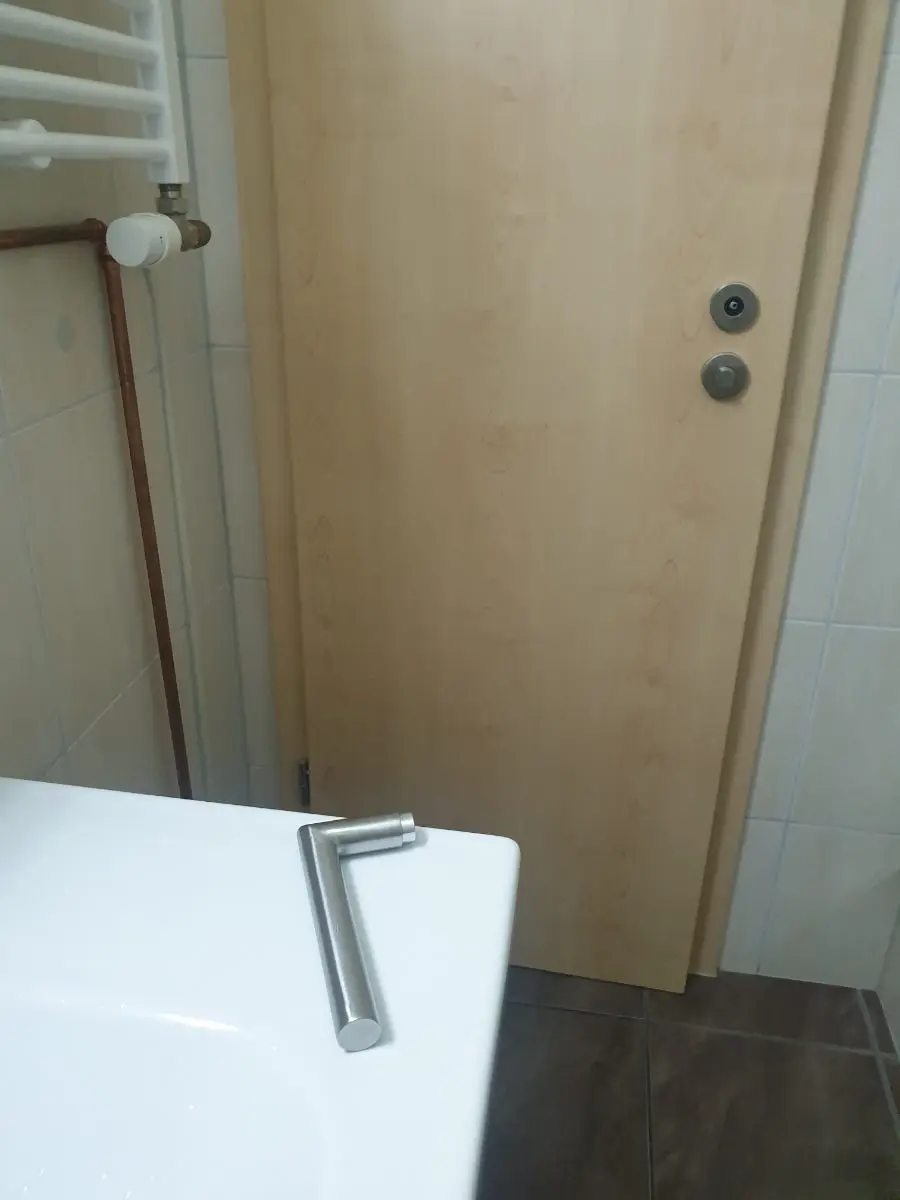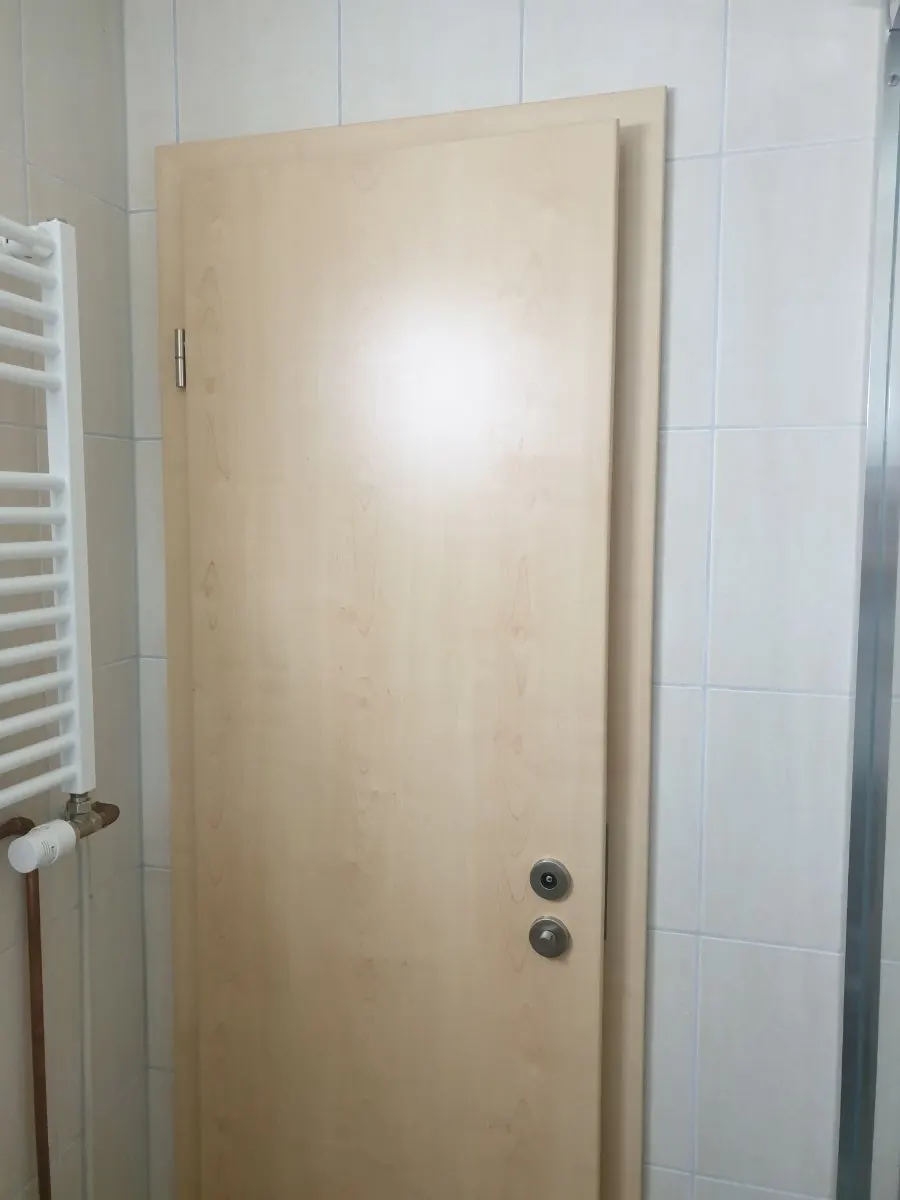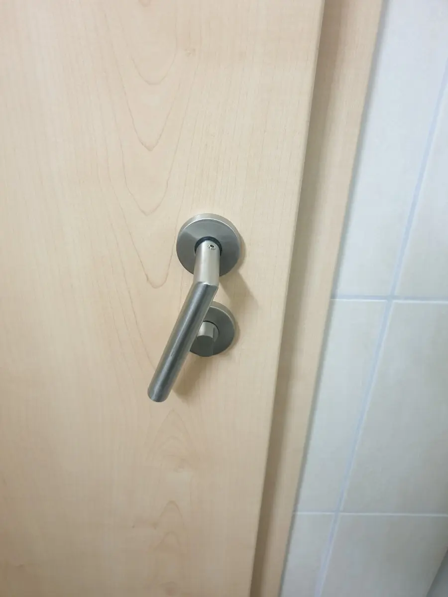 나는 샤워 중이었고, J가 뭔가를 전해주려고 화장실에 들어왔다. 그런데 그 순간, 화장실 문이 닫히면서 문손잡이가 툭 빠져버린 거다. 독일답게 문은 견고하여 틈 하나 없이 딱 맞아 있었고, 문손잡이 걸쇠는 밀려 들어가 열 수가 없다.