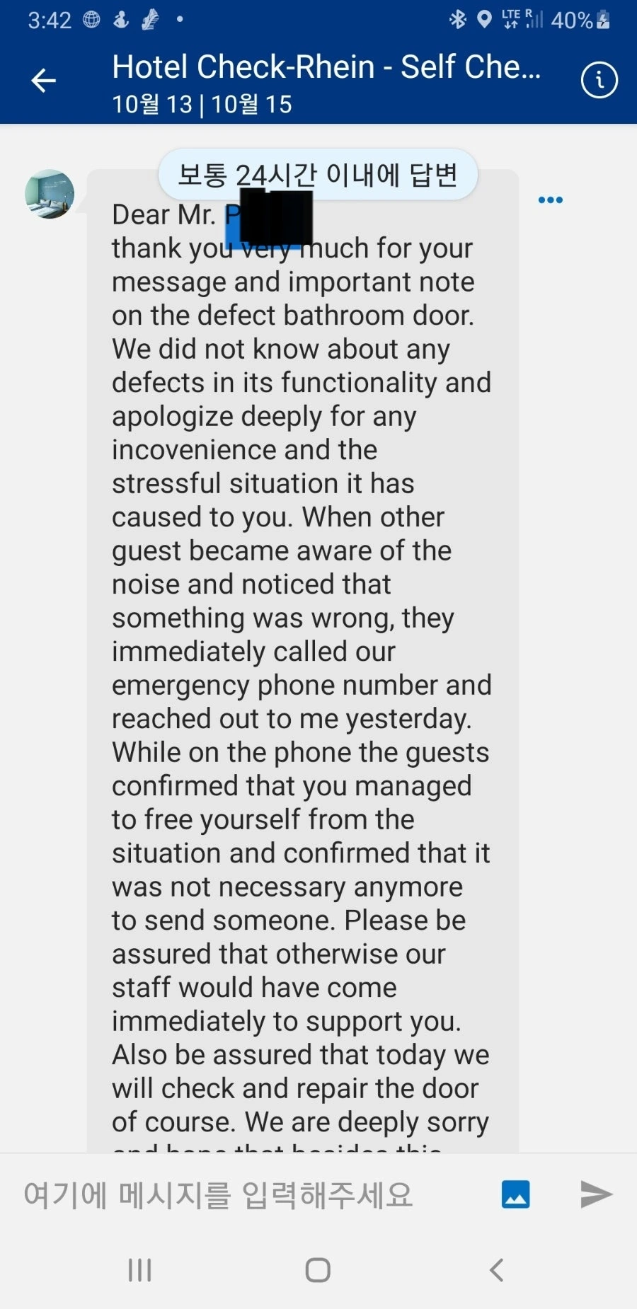 '어제 옆방 게스트가 소음을 듣고 심상찮은 상황인 것 같다는 연락을 해서 알았다. 게스트가 112에도 신고해서 연락을 받고 가려고 했는데 문제가 해결됐다는 메시지를 받았다. 문고리가 그런지는 정말 몰랐다. 정말 미안하다. 다음에 또 오면 10% 깎아주겠다.'