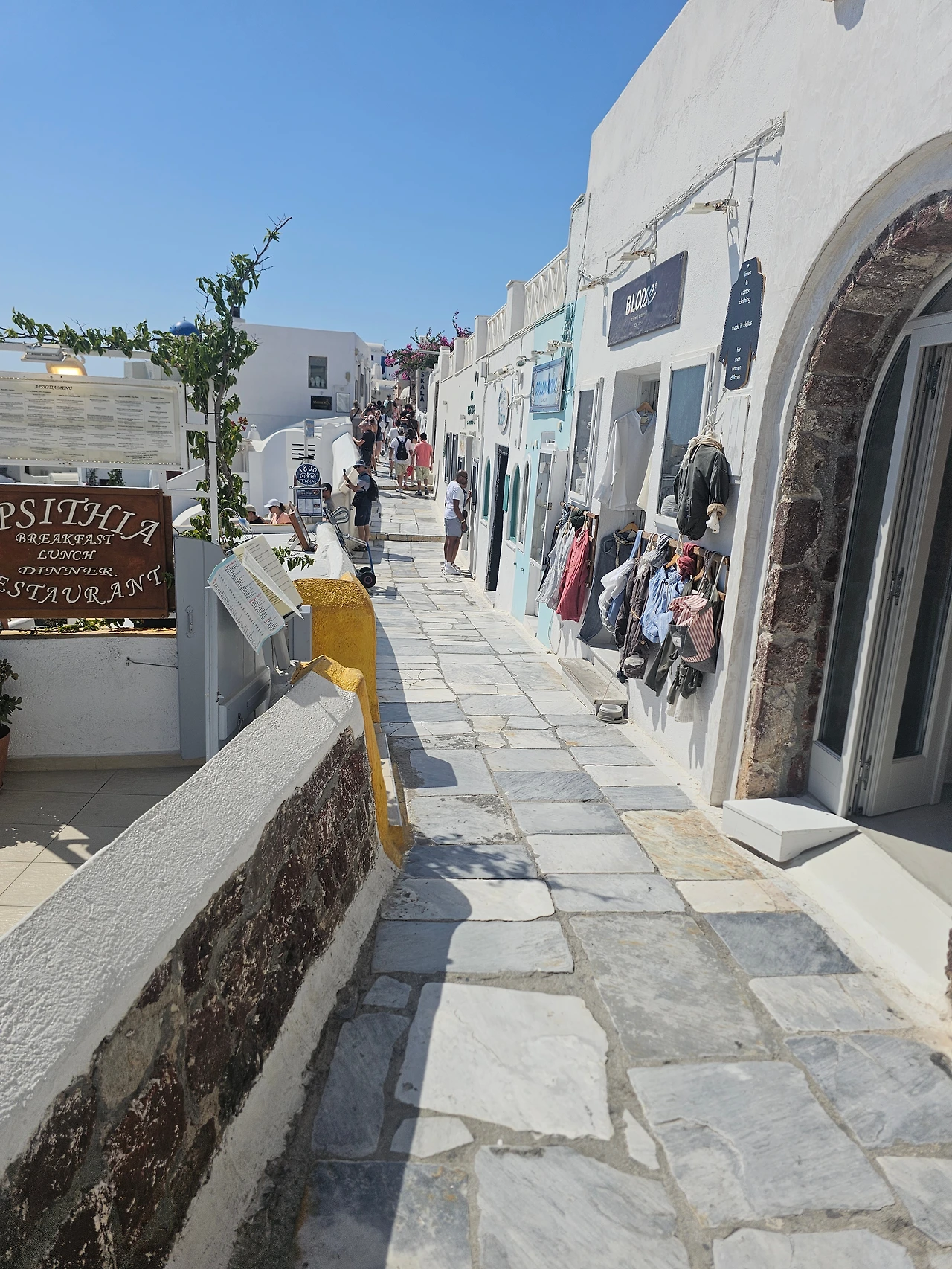피라는 상점과 레스토랑이 즐비한 산토리니의 중심 마을이지만 사진으로 많이 볼 수 있는 산토리니 풍경은 버스를 타고 섬의 북쪽에 있는 또 다른 마을인 이아(Oia)까지 가야 비로소 만날 수 있다. 이아 마을에 내려 찬란한 태양 아래 대리석길이 이어지는 거리를 걷다 보면 마법과도 같은 풍경이 펼쳐진다.