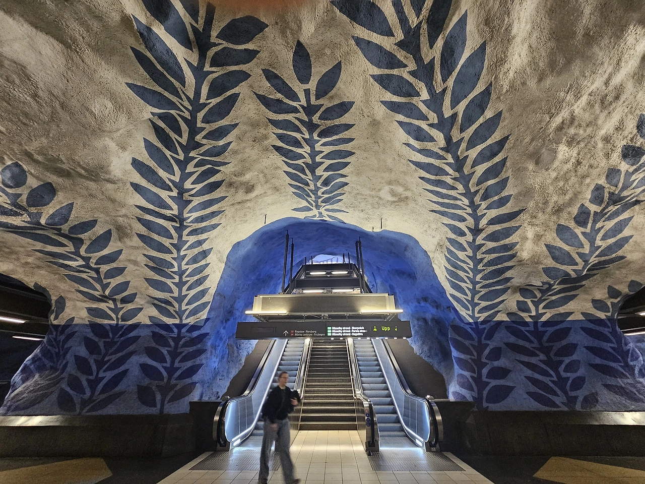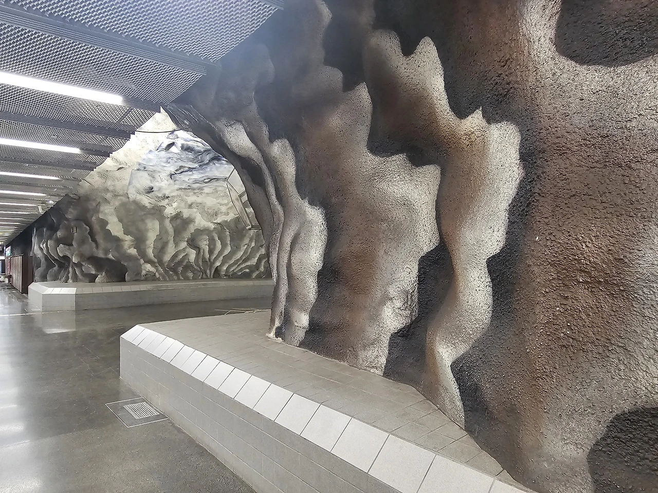 스톡홀름 중앙역과 연결되어 있는 T 센트랄렌역 (T - Centralen)에 가면 1975년에 개통될 당시의 노출된 암석 벽면을 캔버스처럼 활용한 멋진 예술작품을 만나 볼 수 있다.