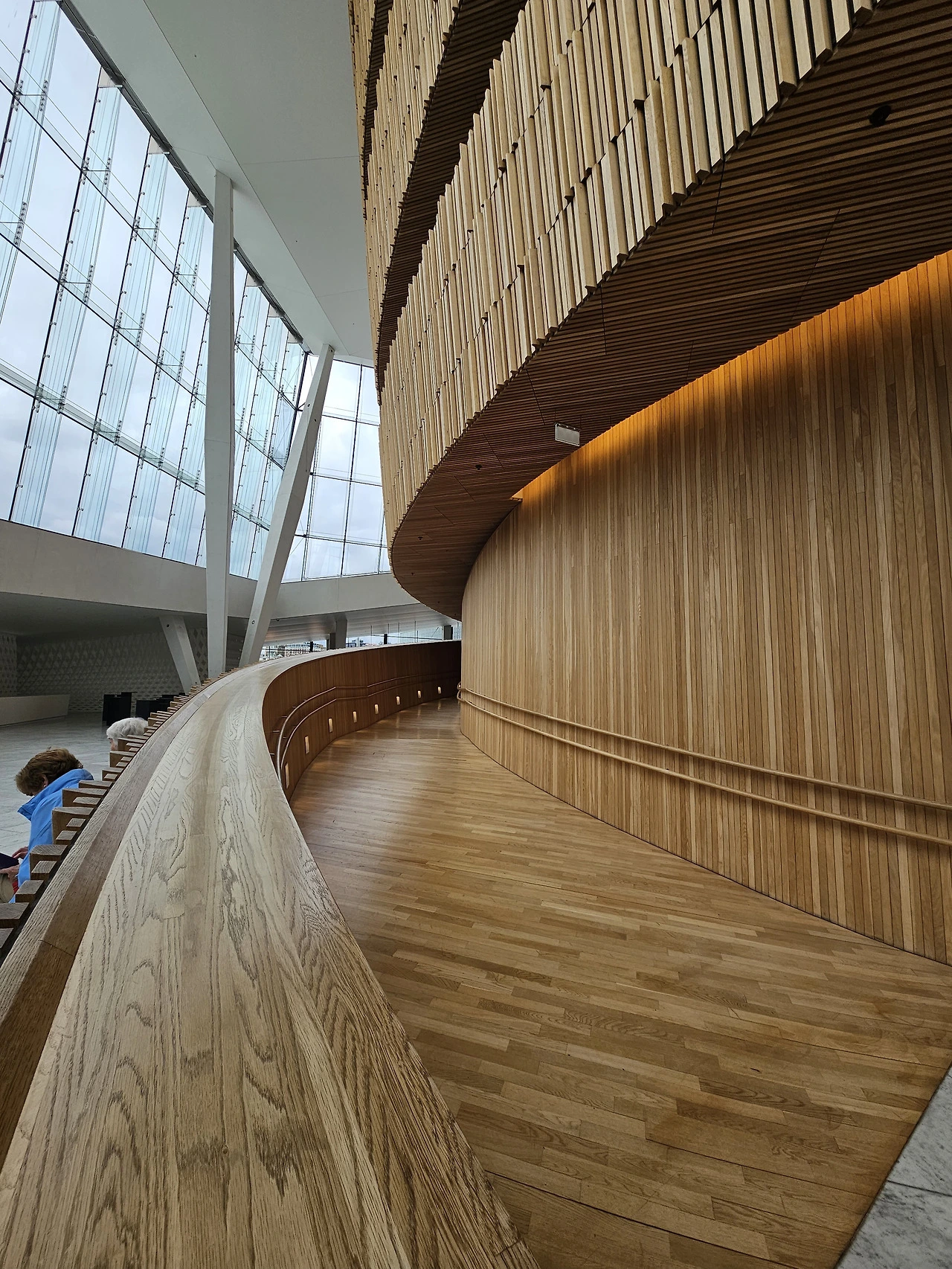 안으로 들어가도 감탄을 자아내는 건 여전하다. 나무로 만든 원형 벽은 오페라 공연장을 감싸며 둥글게 돌아올라 간다. 그 안에서 공연을 본다면 감동은 두 배가 될 것이다.