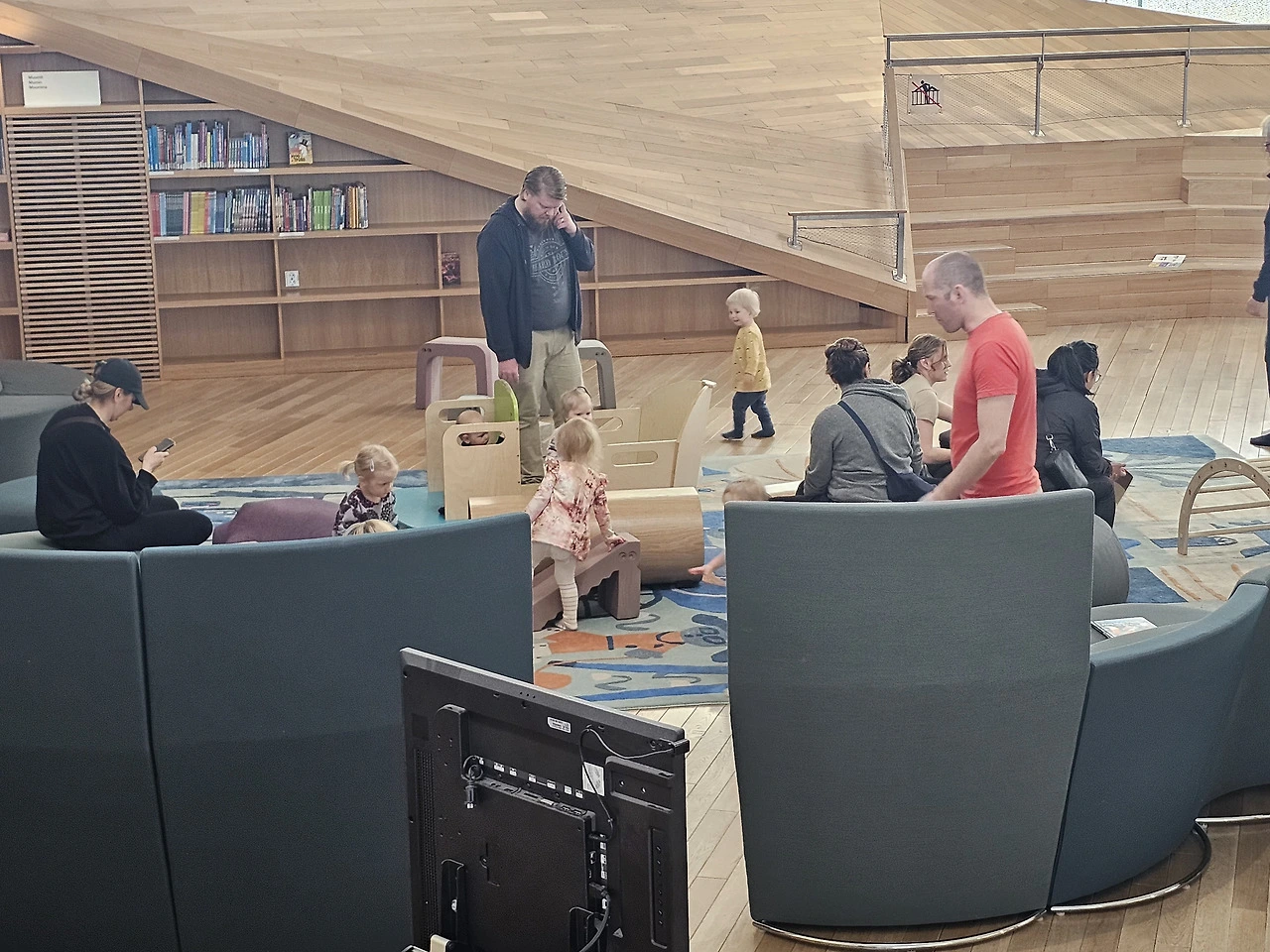 도서관의 반대편 끝까지 가봤다. 도서관에서 음악이 흘러나온다! 아기를 안은 엄마들이 강사의 지도에 따라 아기 체조를 하고, 가족만 앉을 수 있는 어린이 코너의 카펫 위에서도, 바로 옆 놀이터에서도, 아이들이 누웠다가 떼를 부리기도 하면서 자유스럽게 놀고 있다.