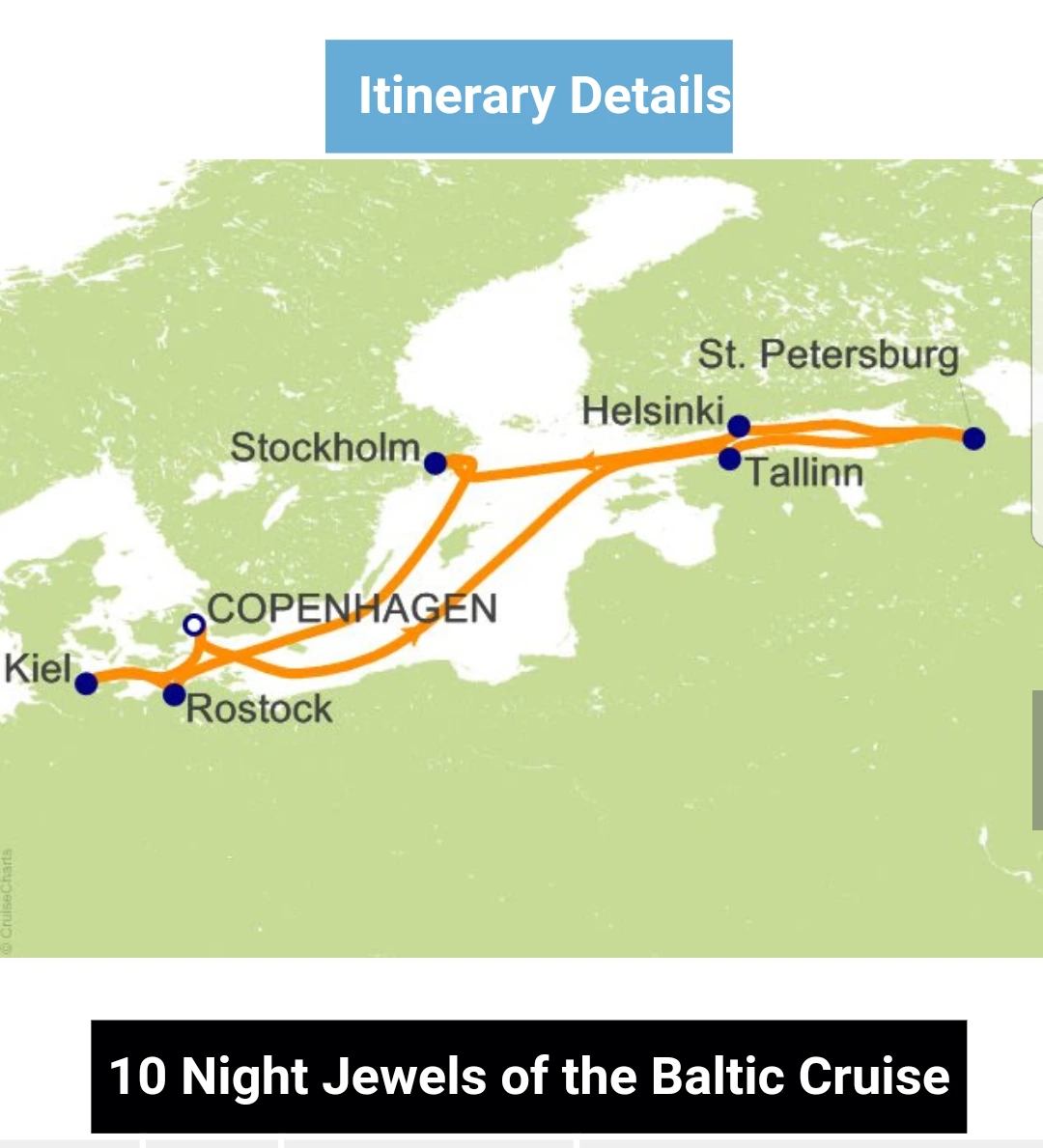 발트해 크루즈는 대부분 코펜하겐, 스톡홀름, 헬싱키, 탈린 등 북유럽 국가의 수도에 기항한다. 일주일 정도의 짧은 코스는 수도만 들르는 경우가 대부분이고 코스가 길어지면 노르웨이의 피오르나 발트해의 다른 항구 도시들이 추가된다.