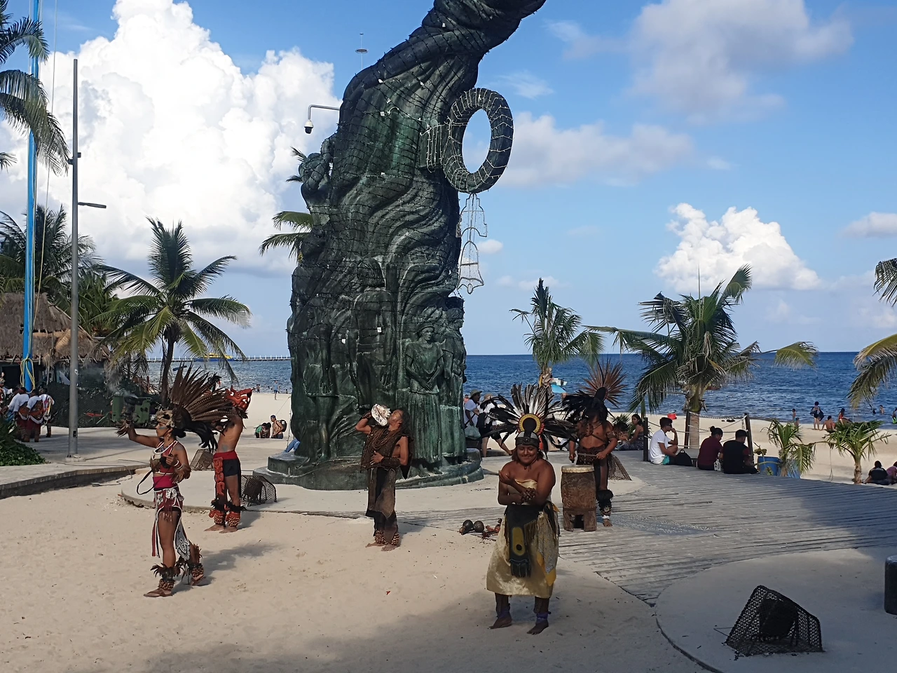 항구 앞의 공원 '로스 푼다도레스(Parque Los Fundadores)'에는 거대한 조형물이 세워져 있고, 그 아래에서는 마야 전통 의식과 댄스 퍼포먼스가 이어졌다.
