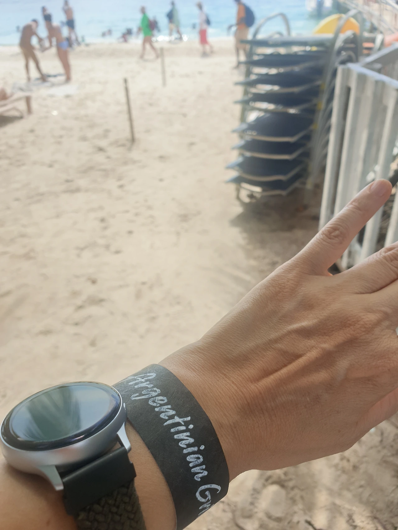 라우라와 함께 해변 입구의 레스토랑으로 들어가 입장료를 내고 종이팔찌를 받았다.