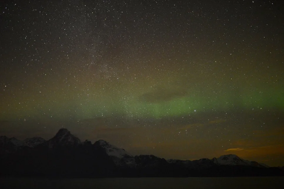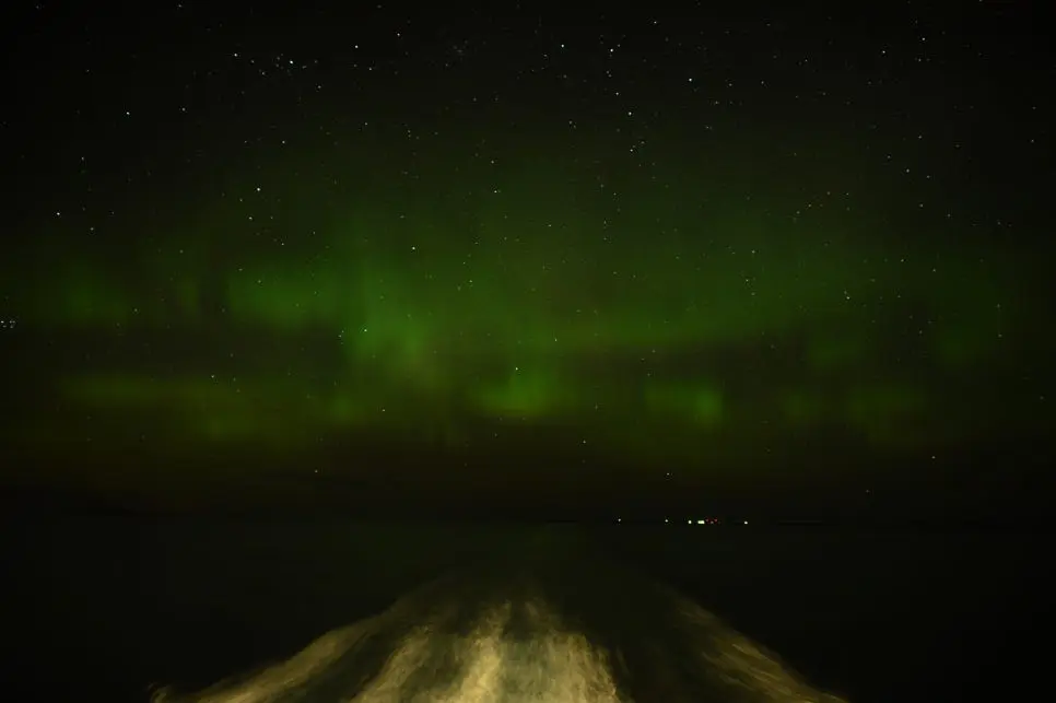 내 눈에 희뿌옇게 보인 그 빛을 촬영한 사진엔 연한 녹색의 오로라가 찍혀 있었다. 카메라가 사람의 눈보다 오로라를 더 잘 잡는다더니 사실이었다.