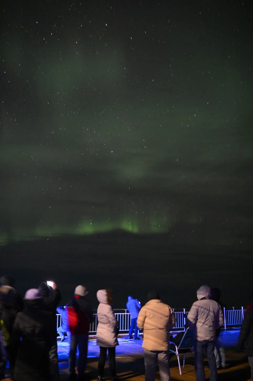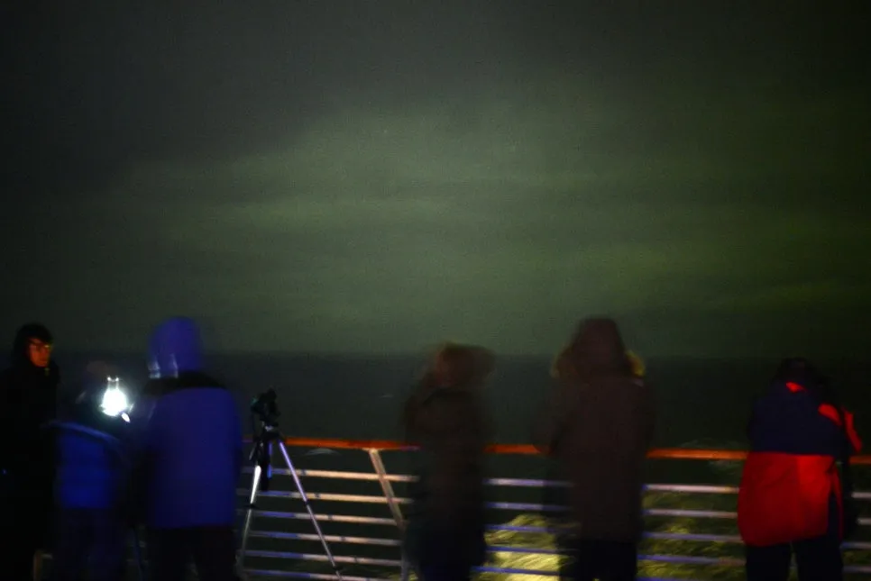 그날 밤 스토크마르크네스(Stokmarknes)를 지날 때 두 번째 방송이 나왔다. 오로라 크루즈란 이름에 걸맞게 이 배에서는 오로라가 뜨면 곧바로 안내 방송이 나온다. 허둥지둥 밖으로 뛰어나온 사람들로 갑판은 순식간에 붐볐다. 하지만 이번에도 내 눈에는 단지 구름과 구별하기 어려운 희뿌연 빛만 보일 뿐이다. 저게 과연 오로라인지 마을의 빛이 구름에 반사된 것인지 확인하기 위해 다른 사람들이 찍은 카메라 화면을 들여다보아야 했다. 그래도 이번 오로라는 앞의 것보다 좀 더 나았다. 북쪽 수평선에 나지막이 엎드려 있다가 넓게 퍼지면서 다시 연기처럼 모이는 순간 희미한 초록빛이 육안으로도 살짝 보였다.