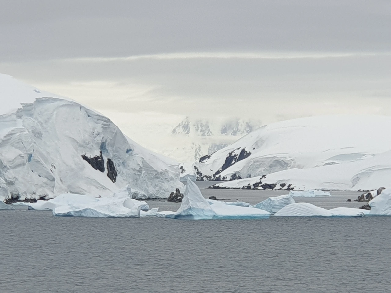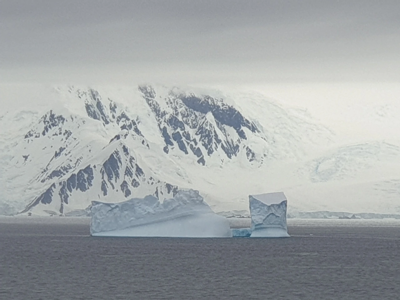 낮게 깔린 구름 아래 얼음상자 같은 모양의 큰 회색 빙산이 주변에 작은 은빛 유빙들을 거느린 채 둥둥 떠 있고, 그 뒤로 눈에 덮인 산이 띠처럼 길게 펼쳐져 있다.