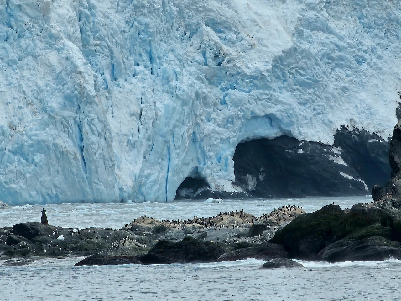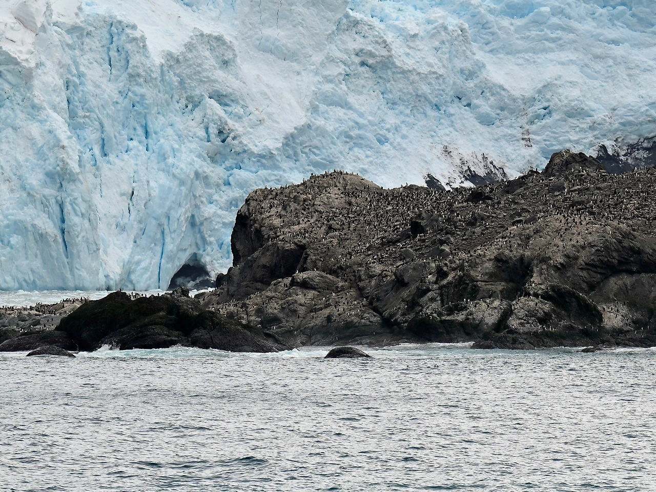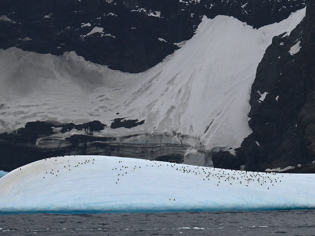 가끔씩 먼 빙산 위에 줄지어 서있는 펭귄 떼도 멋지다. 하얀 빙산 위의 검은 펭귄들은 멀리서 보면 깨소금으로 보인다.