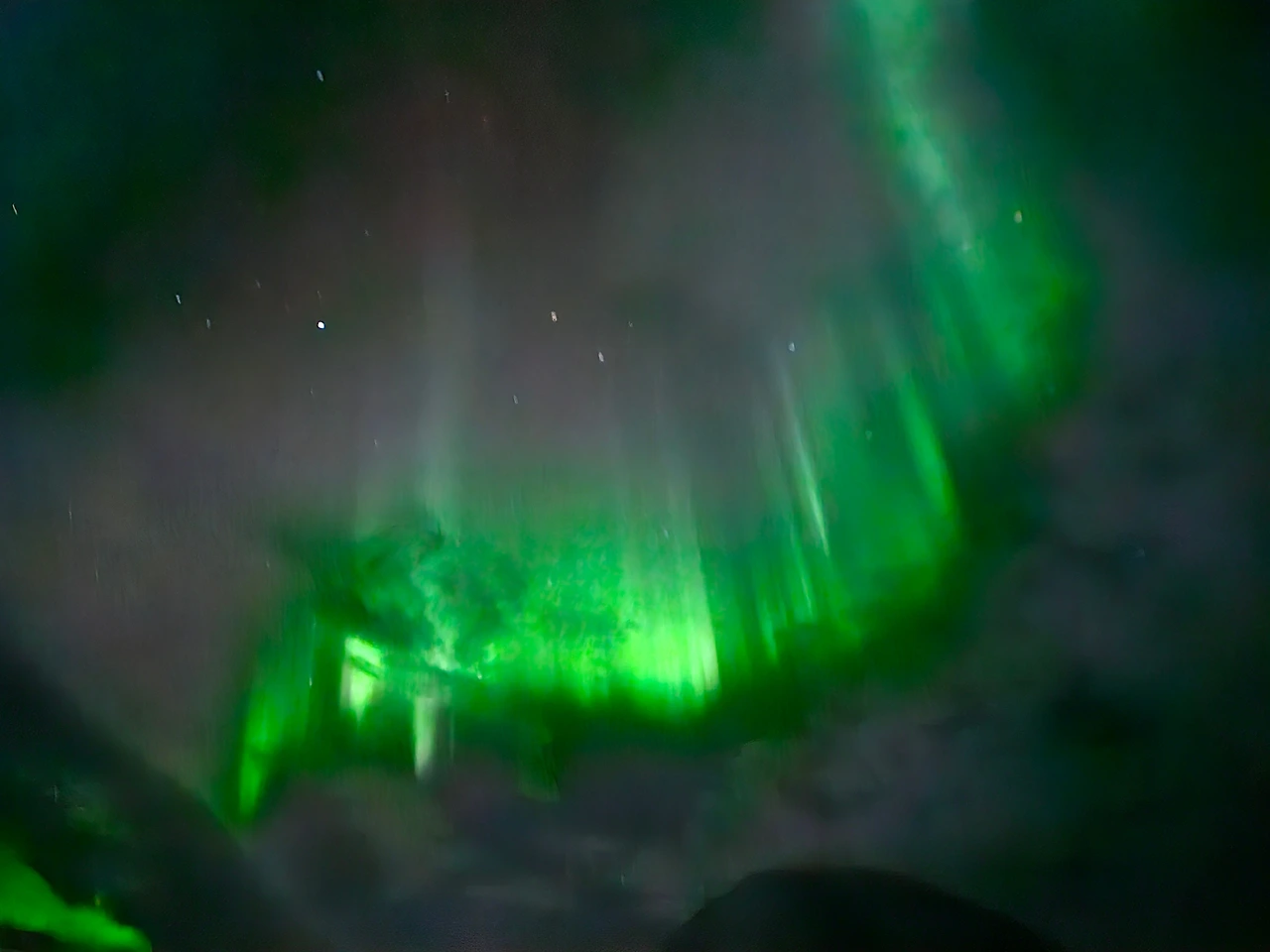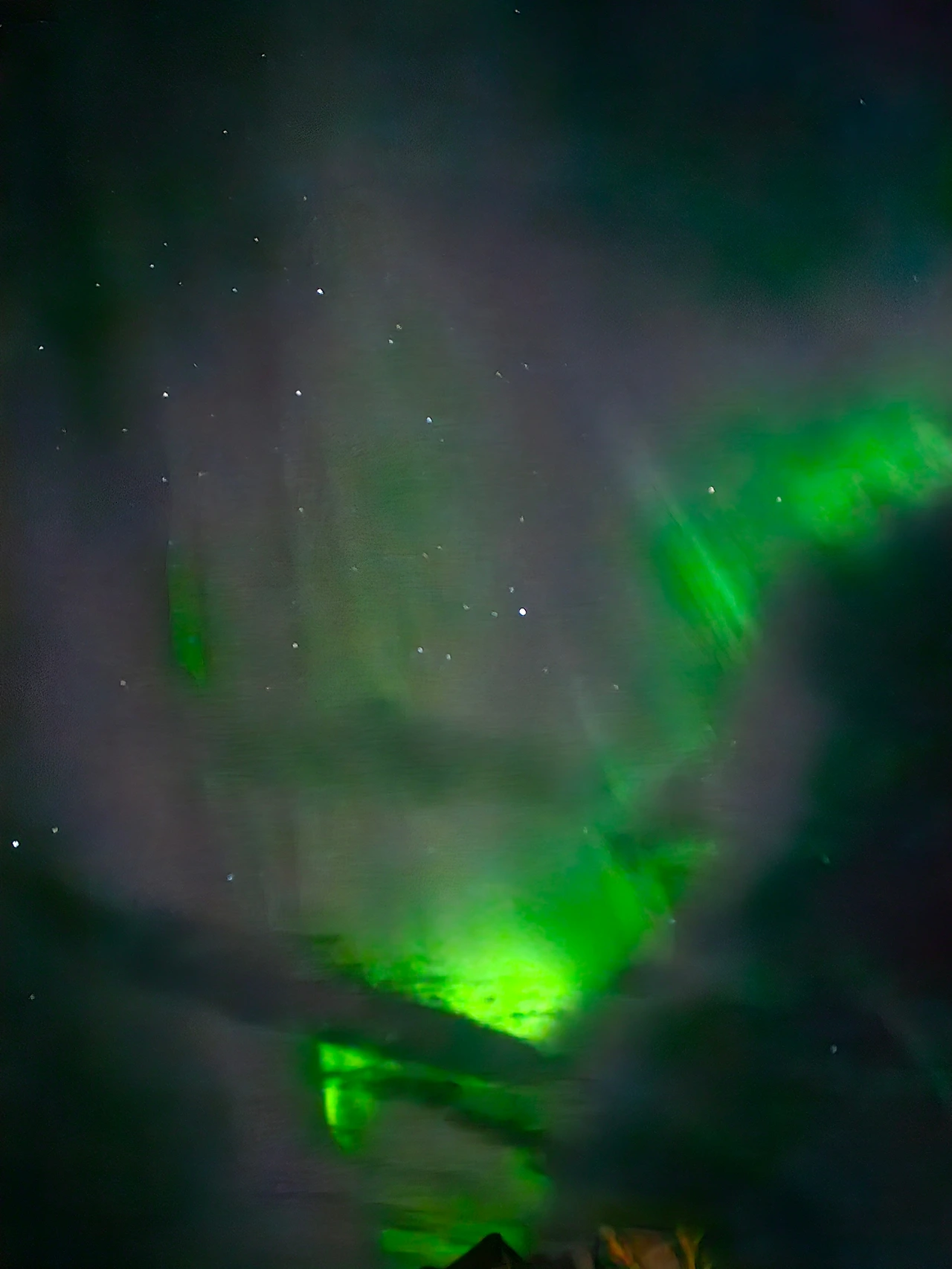 희뿌연 빛이라 구분이 어려워 휴대폰으로 찍어보며 확인해 보니, 사방이 오로라였다. 붉은빛이 섞인 오로라가 하늘 군데군데 피어오른다. 너무 약해서 맨눈으로는 흐린 구름처럼만 보이는 게 아쉬웠다.