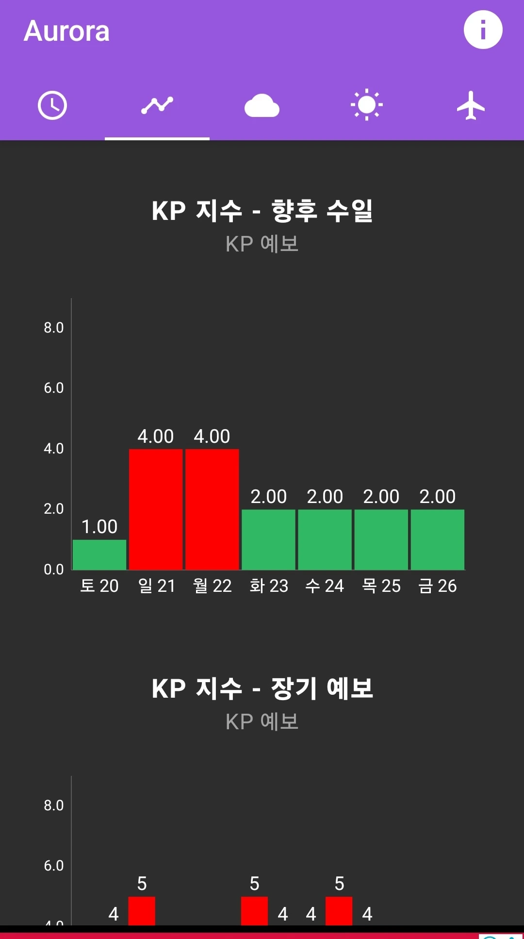 하지만 상황은 녹록지 않다. 일주일 내내 맑던 날씨가 우리가 도착한 다음 날부터 연일 비 예보로 바뀐 것이다. 오로라 앱의 예보에 따르면, 우리가 머무는 2주 동안 KP 지수가 4 이상으로 오르는 날은 단 세 번뿐이다. 게다가 앞으로 일주일간 비가 계속된다 하니, 오로라를 볼 수 있을지 의문이다.