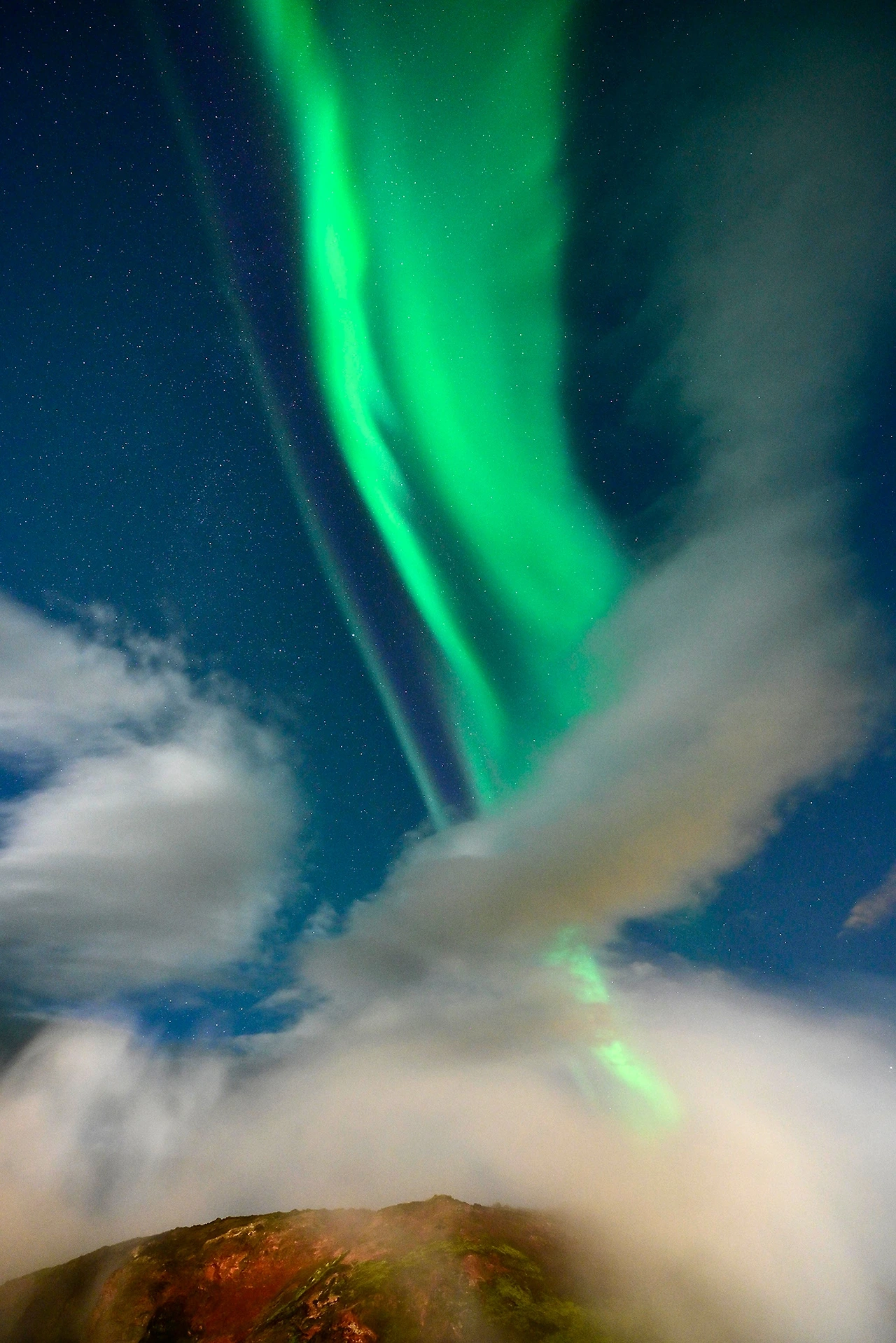 그러나 서부에 도착한 첫날부터 비와 바람, 짙은 구름 속에서 새벽 4시까지 기다리다 결국 실패. 둘째 날도 날씨는 나아지지 않았다. 두꺼운 구름 사이로 간신히 열린 하늘 틈에는 초록빛이 가득했다. 구름 위에서는 어떤 일이 벌어지고 있을지 상상도 되지 않는다. 오로라가 얼마나 강한지, 때때로 구름을 뚫고 초록빛 섬광이 피어올랐다 사라지곤 했다.