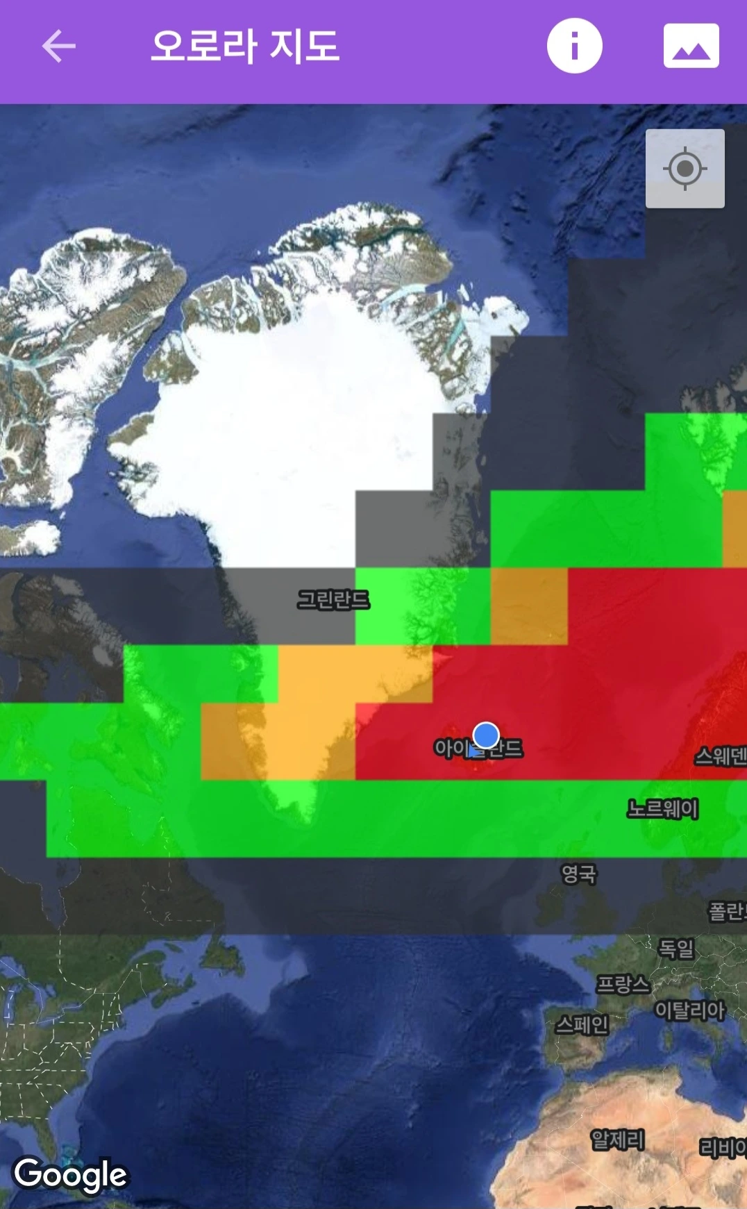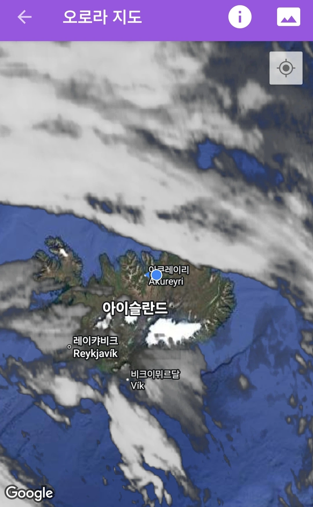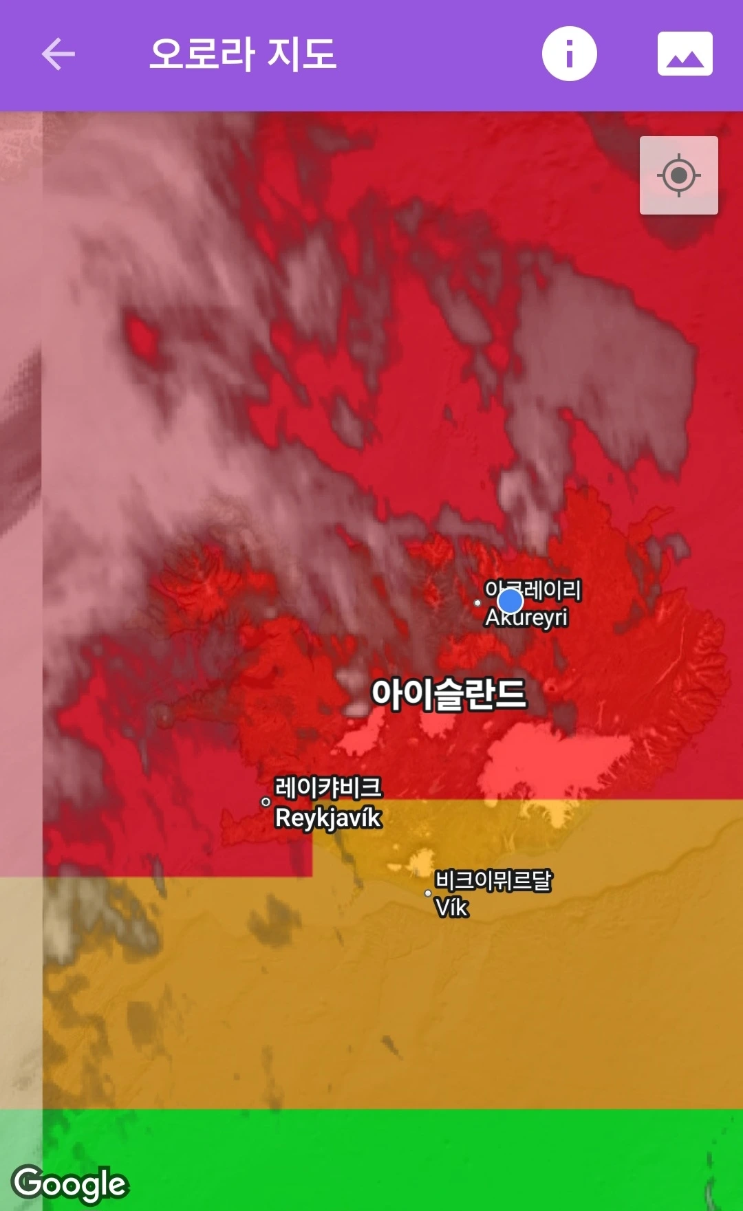 오로라 앱 지도에서는 강도에 따라 색으로 구분해 보여준다. 초록은 지수 2, 5 이상은 붉은색으로 표시되어 한눈에 알아보기 쉽다. 내가 있는 지역이 빨간색 안에 들어가면, 거의 틀림없이 오로라를 볼 수 있다고 해도 과언이 아니다. 하지만 그것보다 더 중요한 변수는 바로 구름의 양이다. 하늘이 구름으로 완전히 덮여 있다면, 아무리 강력한 지자기 폭풍이라도 소용이 없다.