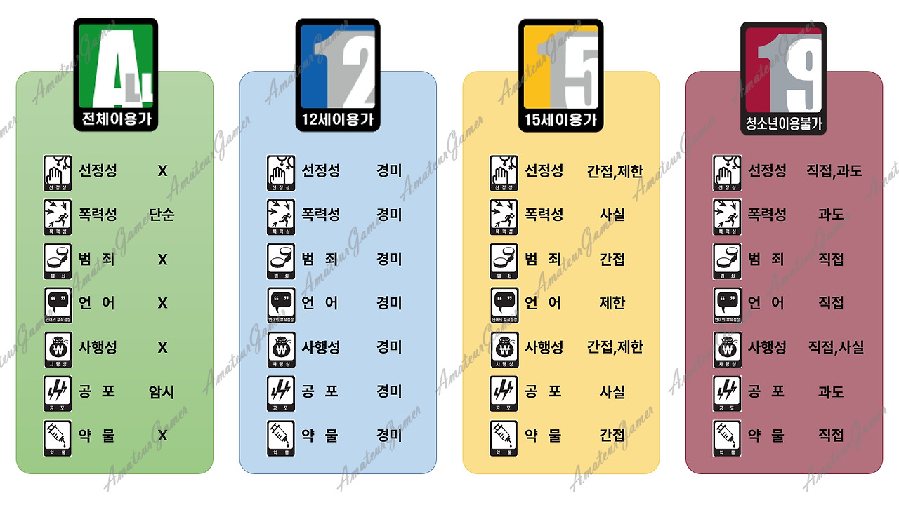아이들은 게임 등급이 더 친숙하겠지만, 어른들에게는 아마 영화 등급이 훨씬 익숙할 것이다. 두 장르의 등급 분류는 외견상 비슷한 체계처럼 보이지만, 사실 게임은 영상물에 비해 훨씬 엄격한 잣대가 적용된다.