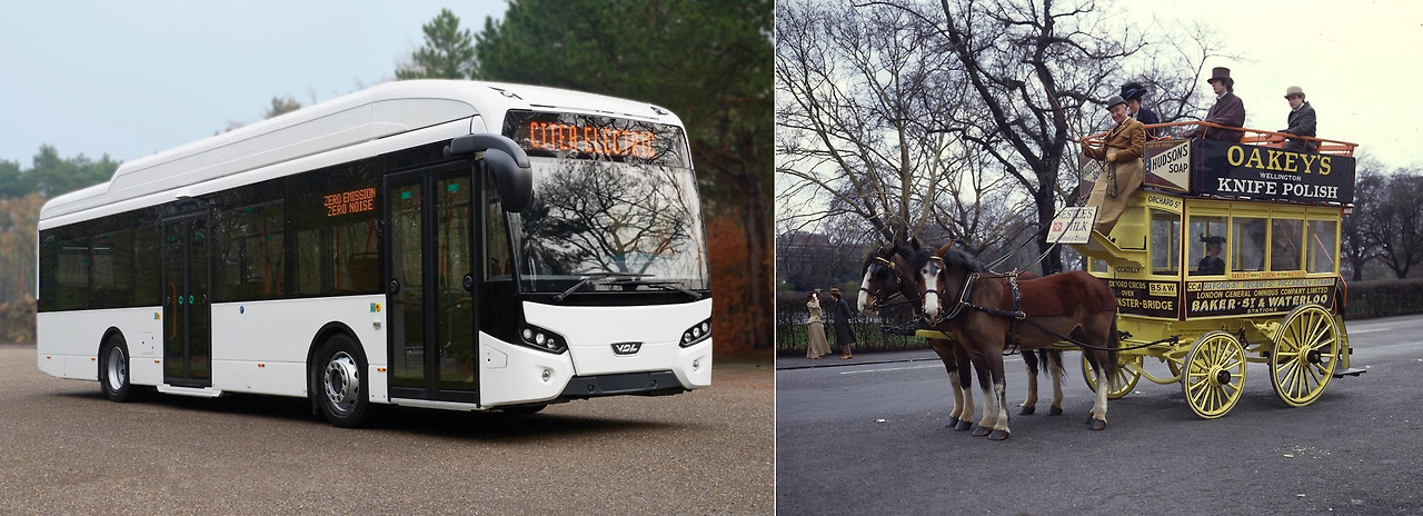 마지막은 버스입니다. 이전에 버스의 역사를 다루면서도 살펴봤듯, 버스는 다인승 대중교통 마차 옴니버스(omnibus)를 축약해 만든 말입니다. 최초의 버스 마차가 멈췄던 정류장 앞 가게에 라틴어로 '모두의'라는 뜻의 omnibus라는 광고문구가 붙어있었는데, 그것이 모든 사람을 위한 교통수단과도 잘 어울려 붙여진 이름이었죠. 20세기 초까지도 대부분의 버스가 옴니버스로 불렸는데, 이후 대중화되면서 이제는 '버스'로 통용됩니다.