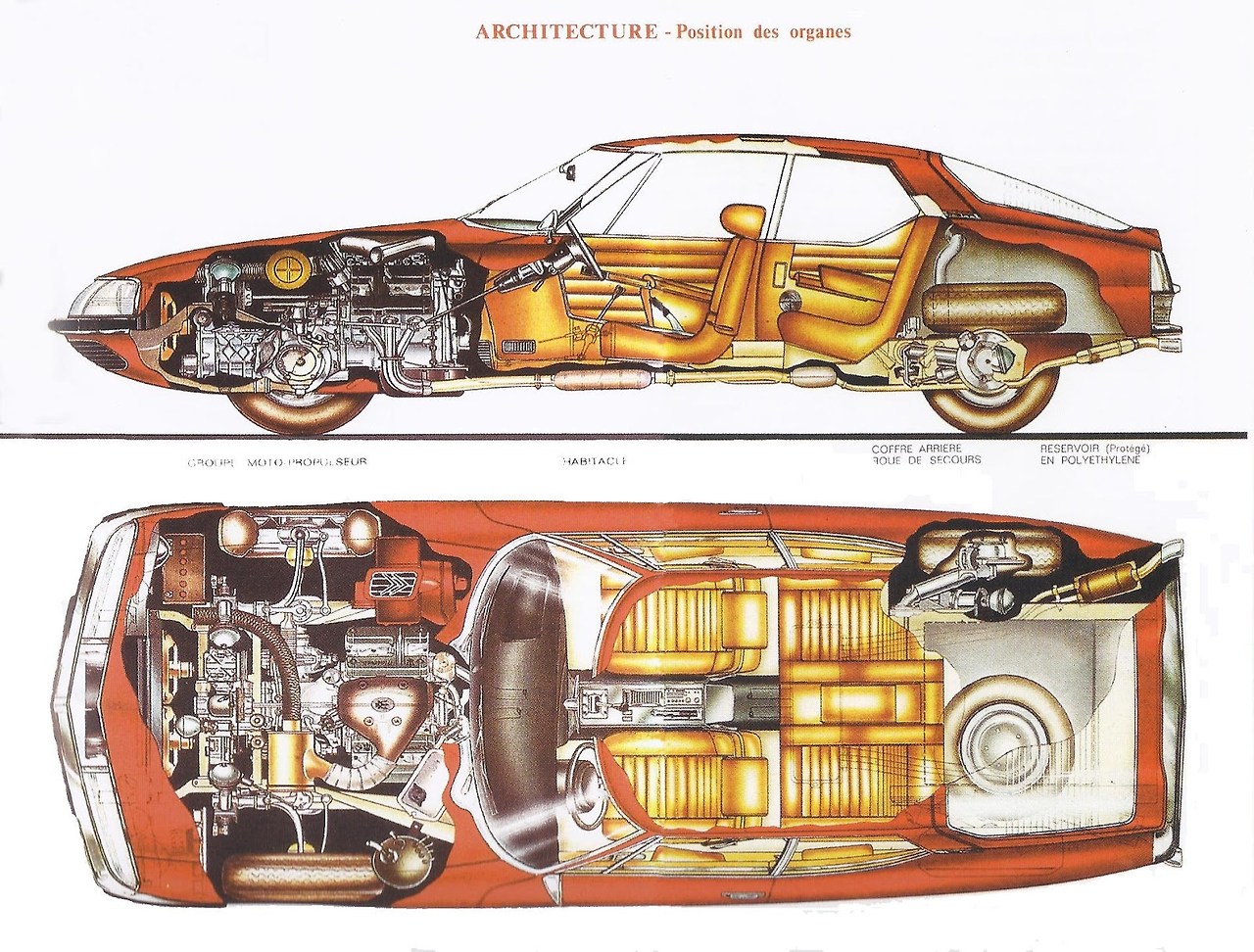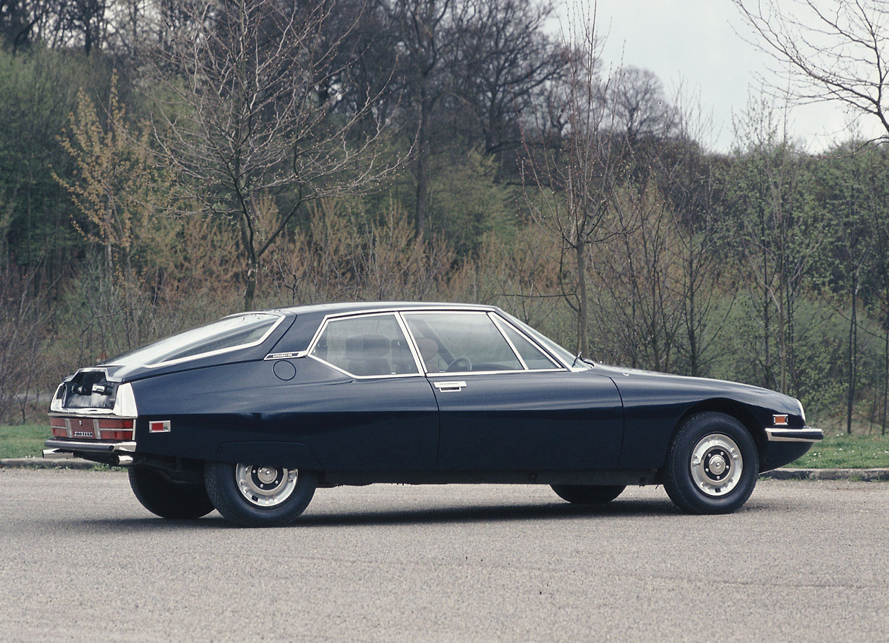 외관 디자인은 시트로엥의 디자인 수장이었던 로베르 오프롱(Robert Opron)이 맡습니다. 앞서 DS의 페이스리프트, 벨페골 트럭 등의 디자인을 맡았던 그는 곡선이 지배하던 60년대 스타일이 아닌, 매끄러운 직선과 과감한 면처리를 강조한 럭셔리 쿠페의 디자인을 빚어냅니다.