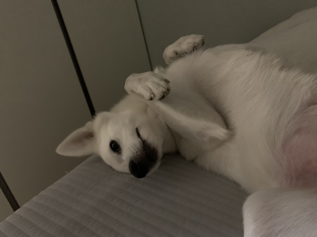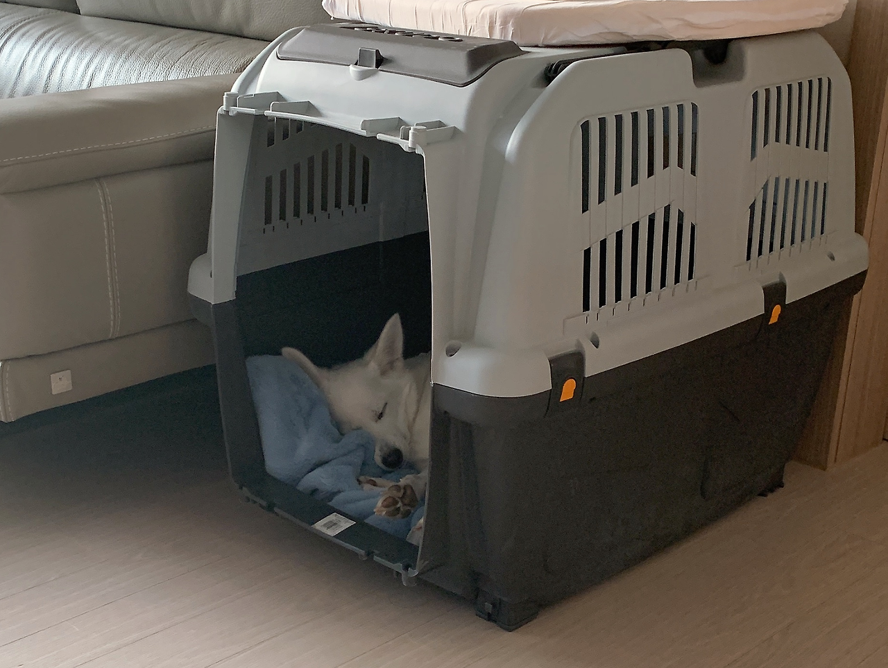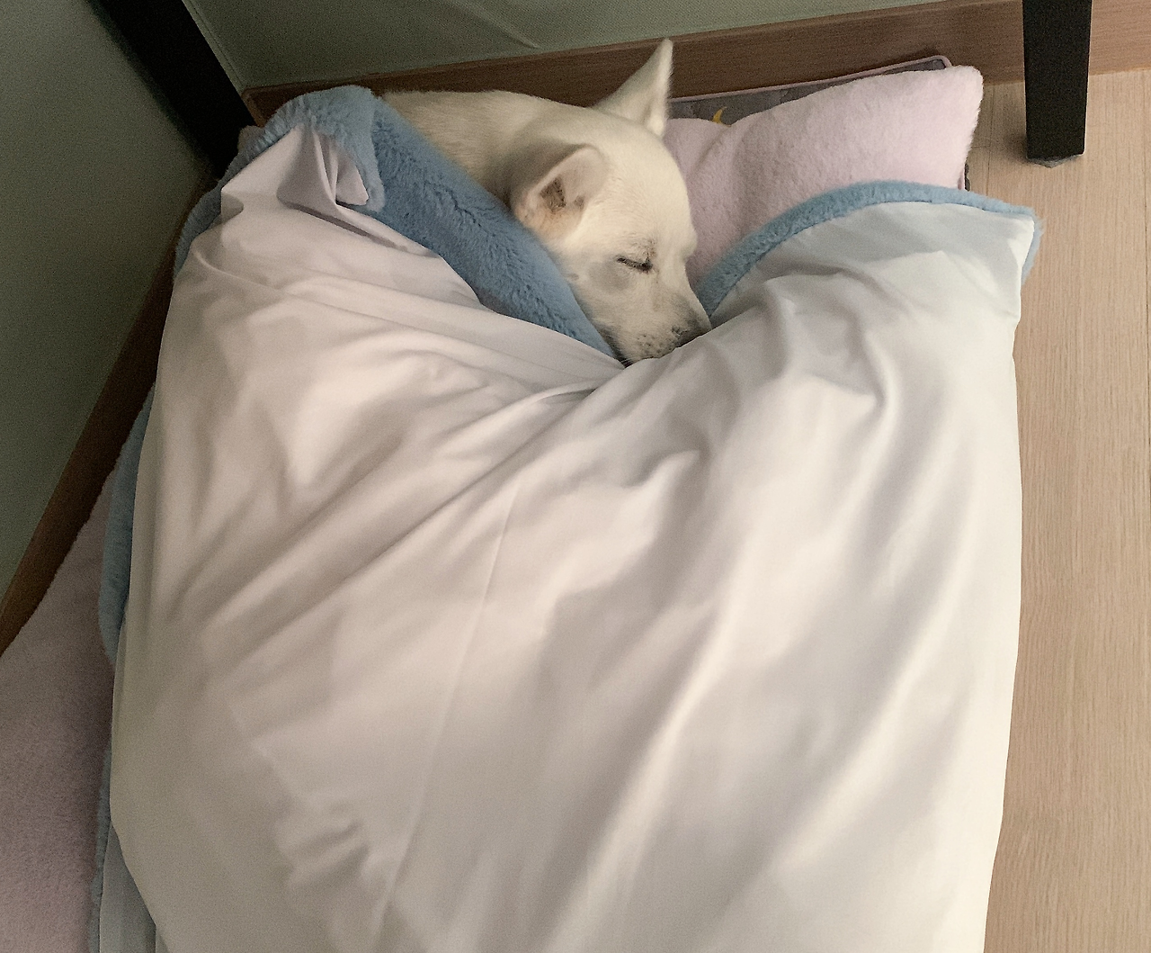 산책 후 오전은 주로 레체의 아침잠 시간이다. 동거인들이 업무나 할 일을 하는 동안 레체는 책상 밑이나 켄넬 안, 또는 침대 위에서 조용히 잠을 잔다.