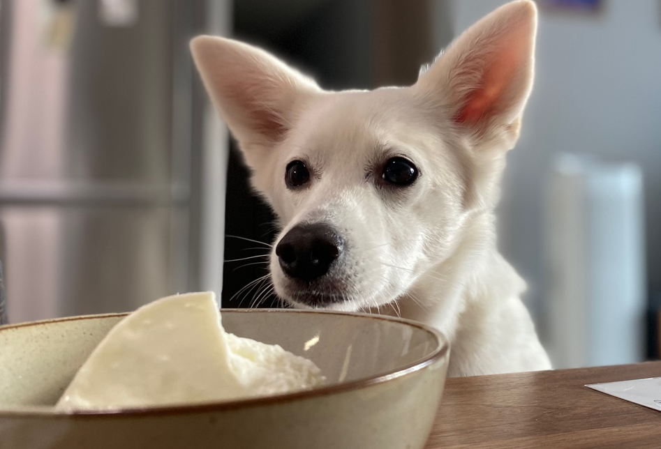 아침이 준비되면 레체는 사료를 우리는 그때그때 준비된 식사를 한다. 레체가 커감에 따라 식탁에 코를 들이밀고 우리 음식을 탐내는 일은 점점 줄고 있다.