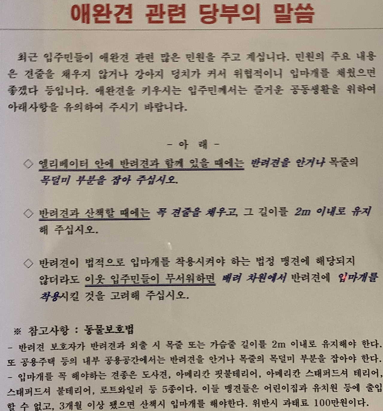 얼마 전에는 산책하던 동거인이 관리아저씨로부터 주의를 받았단다. 주변에서 민원이 들어와서 그러는데 강아지 목줄을 절대 풀지 마시고 입마개도 하셔야 할 것 같다고. 목줄이야 늘 꽉 잡고 있는데 5대 맹견도 아닌데 입마개를 할 필요는 없는 것으로 알고 있다고 대답했다는데. 그러고 나서 며칠 후 엘리베이터 앞에 다음과 같은 안내문이 붙었다.