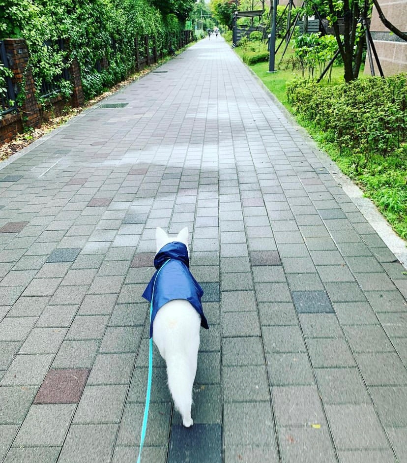 결국은 얼굴을 반쯤 가린 채로 살짝살짝 걷다가 결국 얼굴과 귀를 내놓아야 즐겁게 산책을 시작했다.