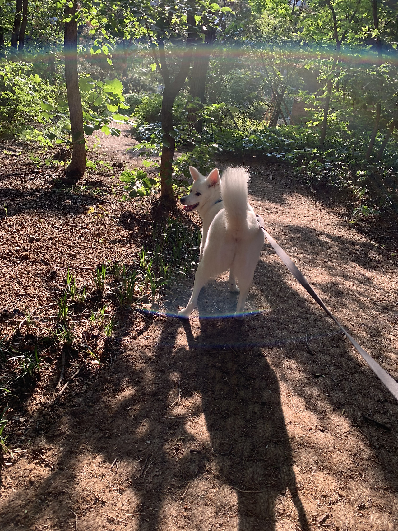 가면 너무나 편해하고 열심히 냄새를 맡는 레체. 그제야 나는 이게 너의 소확행이었구나 깨닫는다. 이 행복해하는 모습을 담아 놓으려고 급히 카메라를 꺼내니 레체 뒤로 빛 무지개가 뜬다.