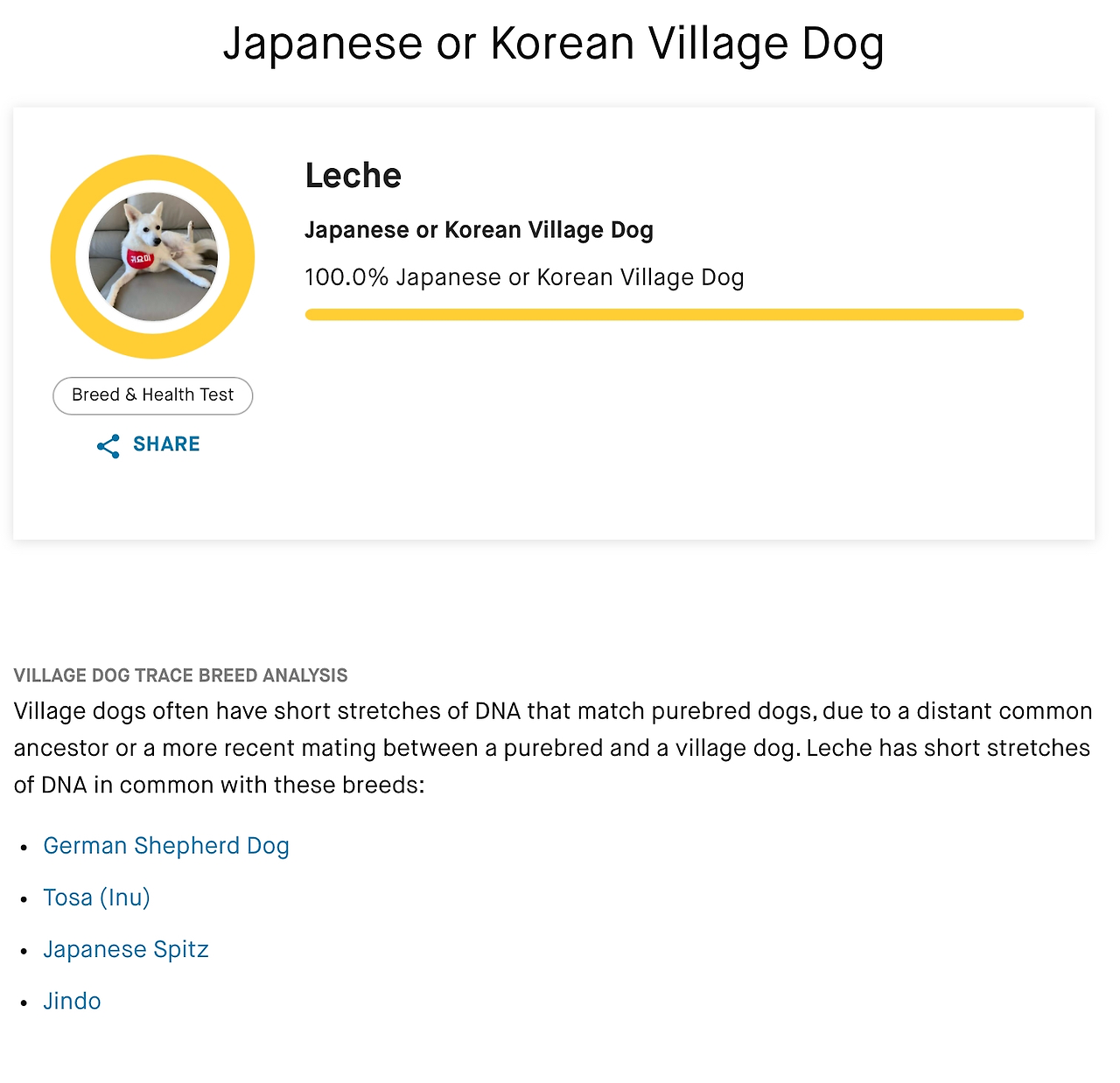 레체가 진도, 스피츠, 셰퍼드 그리고 도사견의 피가 흐르고 있다는 것은 흥미로운 수확이었지만 어쨌거나 레체는 100% 한국 시골개, 즉 시고르잡종이라는 결론은 조금 힘 빠지는 것이기도 했다.