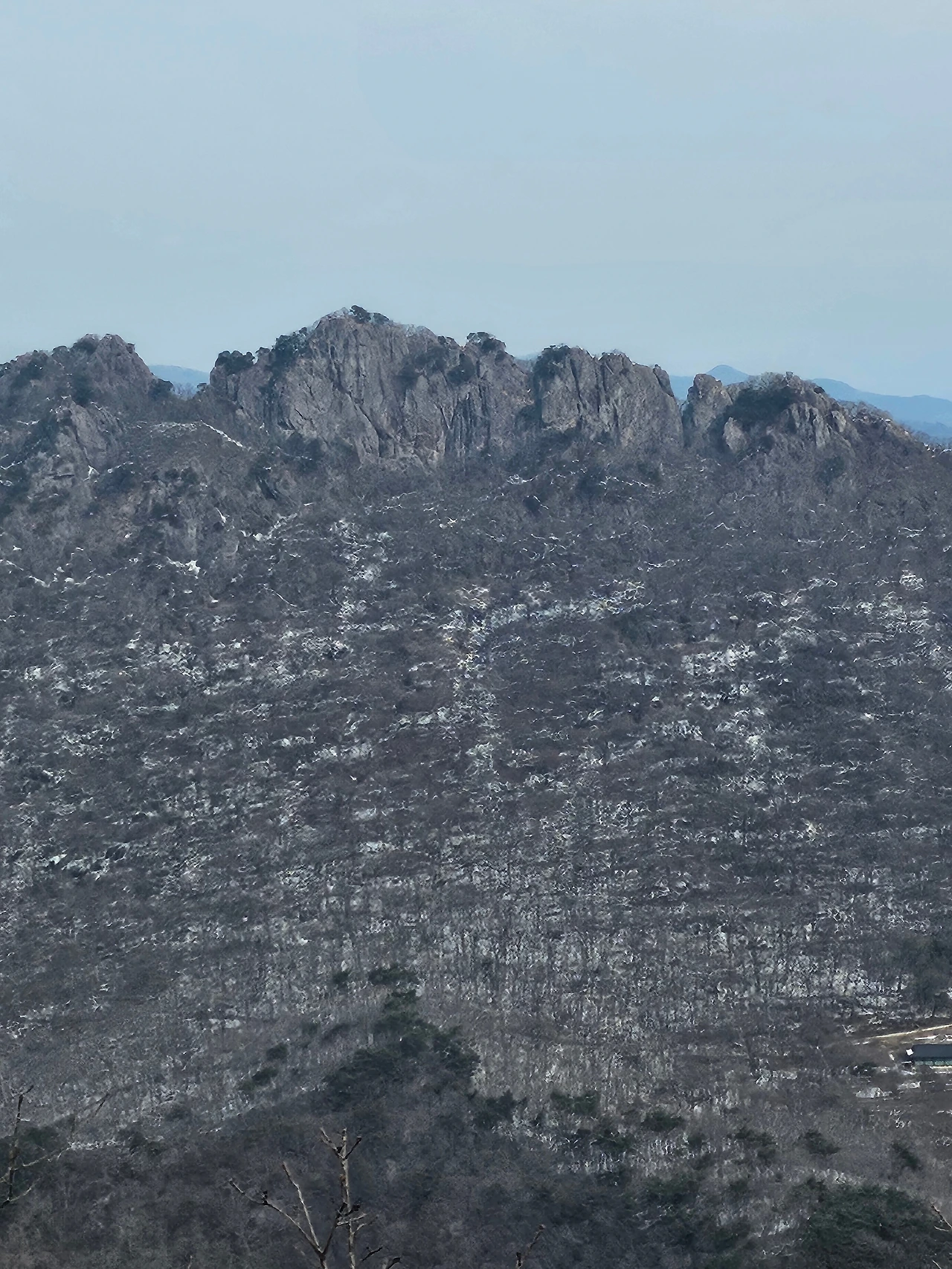 설산 풍경에 펼쳐진 마른 참나무, 밤나무 우듬지에 겨우살이가 지천이다.