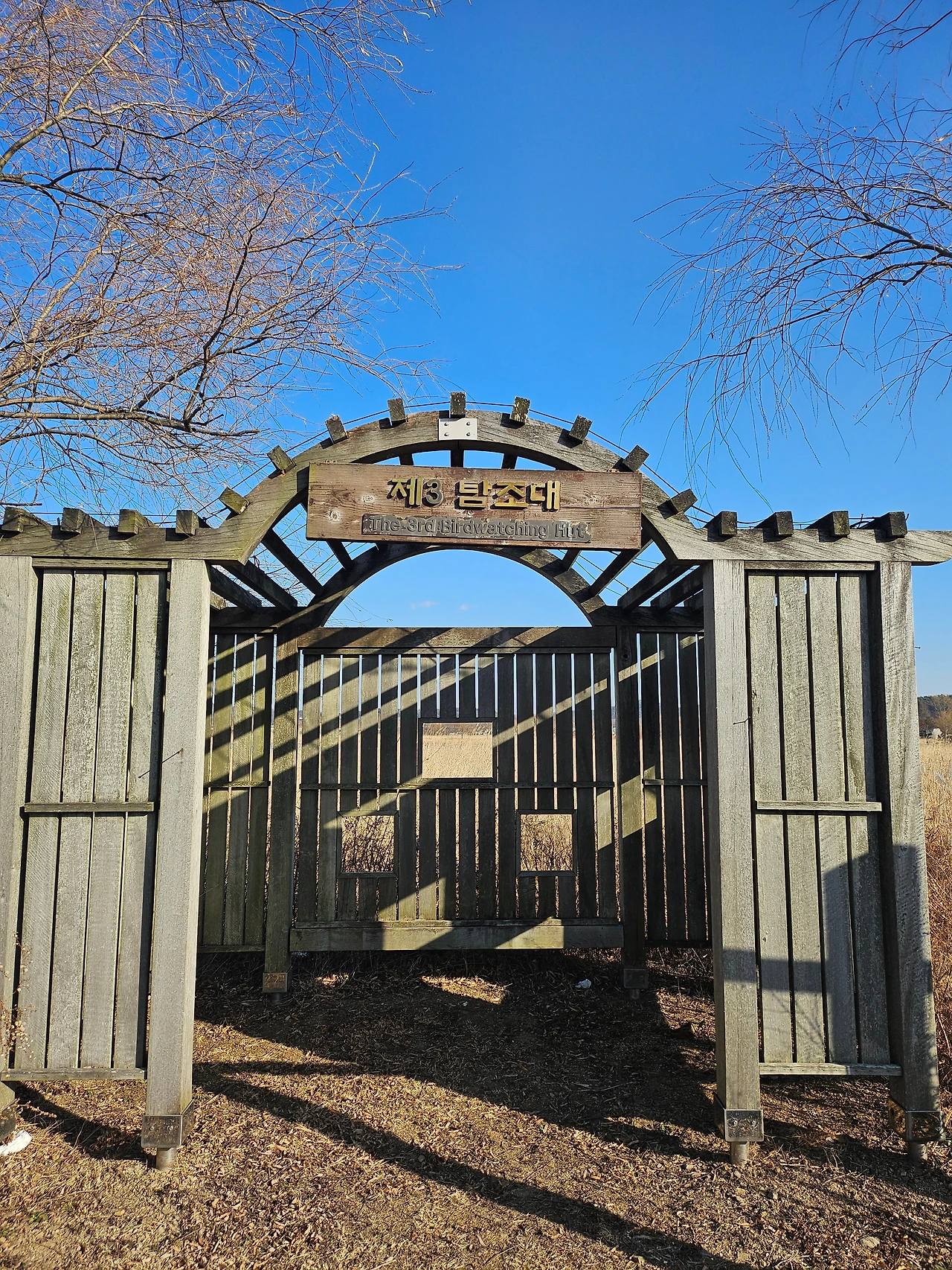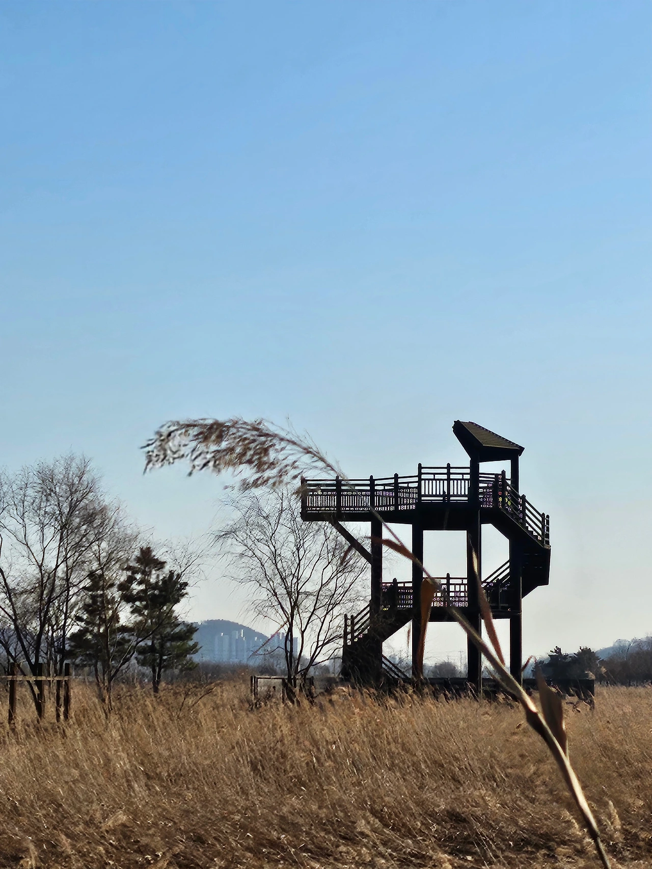 전망대 위에서 바라보는 갈대와 호수 위를 날아오르는 겨울새들의 군무가 저녁노을 속으로 빨려 들어간다.