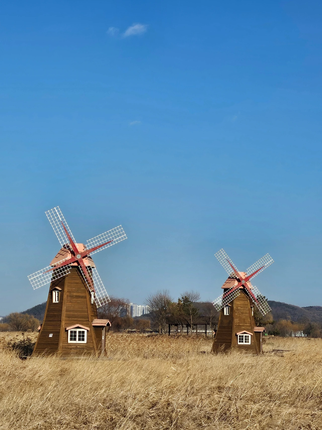 염전의 끝자락 울창한 갈대밭 위로 바람을 가르는 풍차가 전혀 다른 이국적인 풍경을 연출하며 삼 형제처럼 서로를 바라보며 나란하게 서 있다. 풍차의 발아래 갈대 무리가 바람을 타고 흔들리는 것이 좌에서 우로 앞에서 뒤로 춤추는 모양이 살아서 움직이는 듯한 착각에 빠진다.