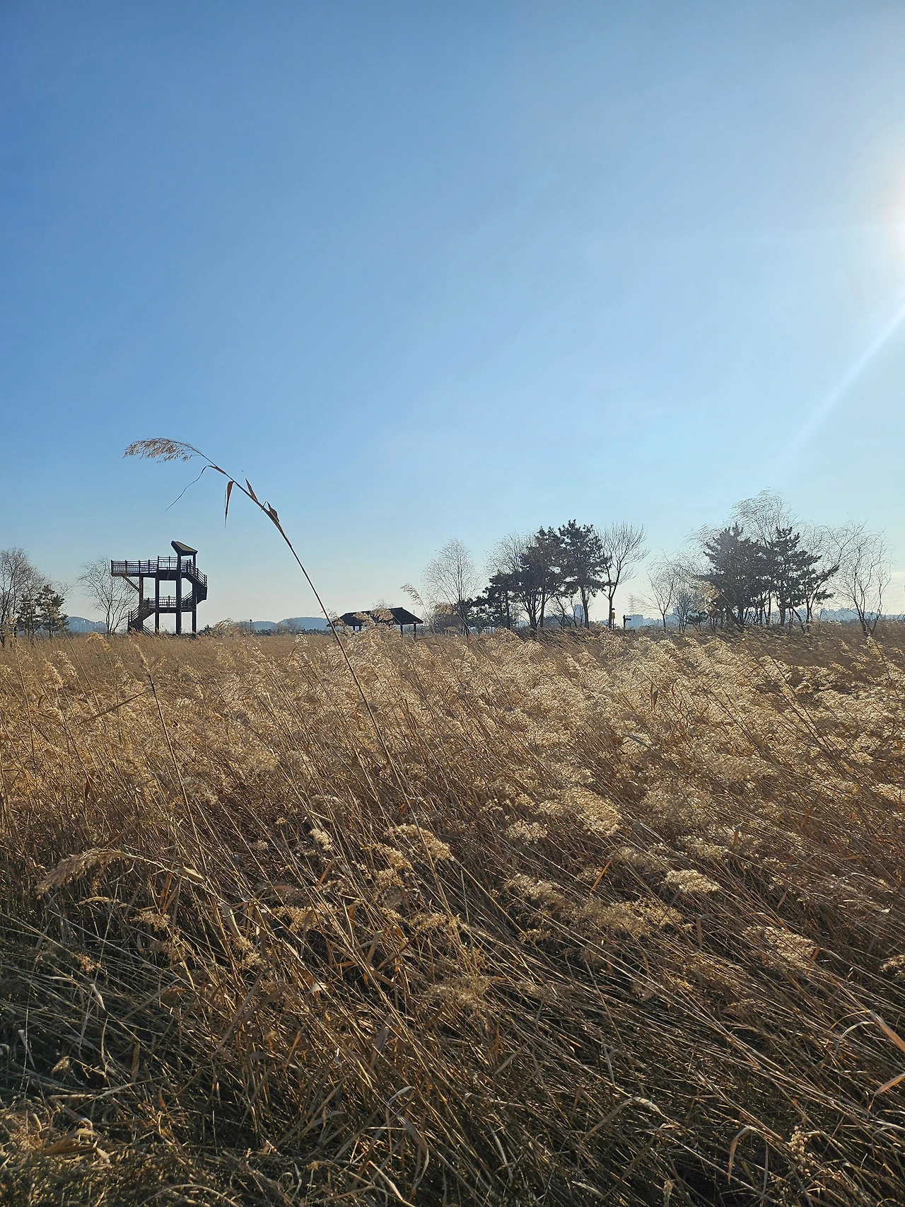 소래 생태습지 여행의 매력은 갈대가 울창해서 미로가 시작되는 지금부터가 시작이다. 황갈색 갈대 사이에는 슬그머니 기어가는 뱀처럼 구불구불하게 길이 이어지고 중간에 커다란 소나무 몇 그루 심어진 곳에는 쉼터가 있어 여행자의 발길을 위로한다.