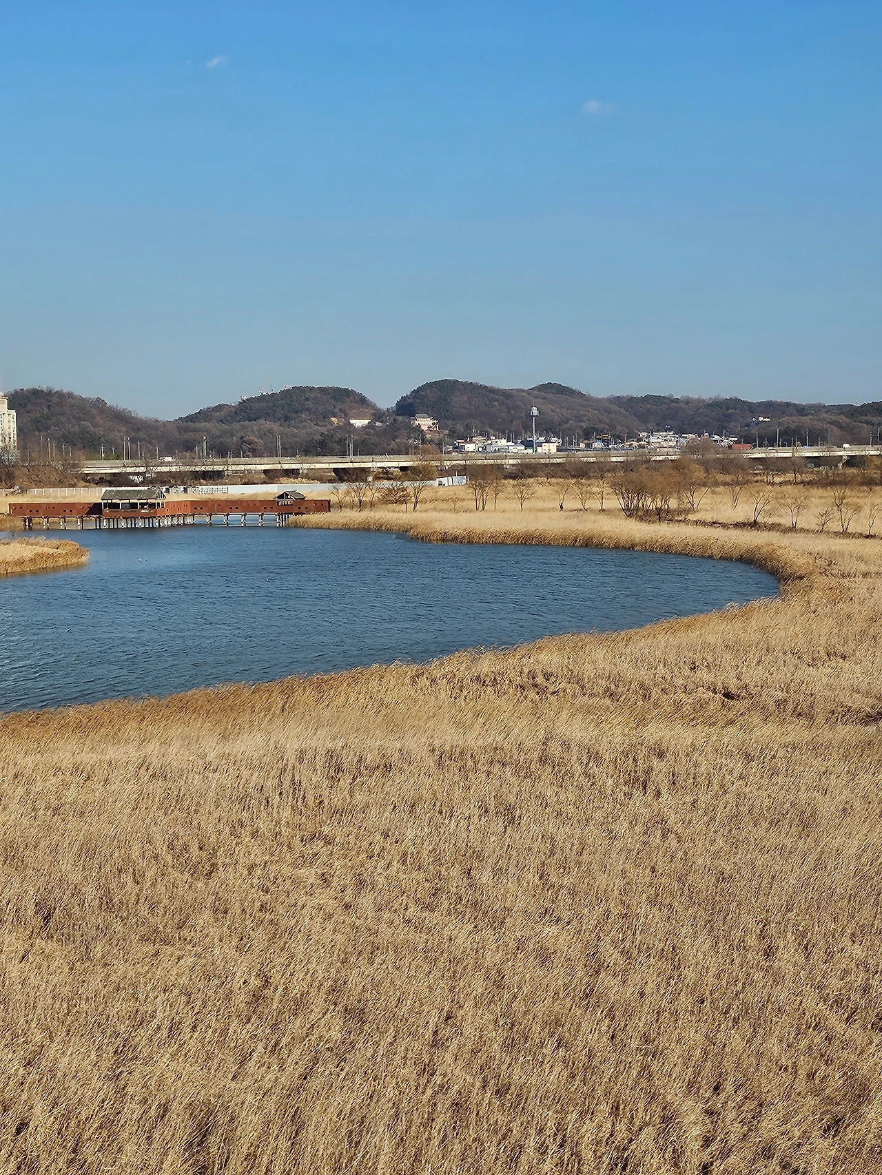 전망대 위에서 바라보는 갈대와 호수 위를 날아오르는 겨울새들의 군무가 저녁노을 속으로 빨려 들어간다.