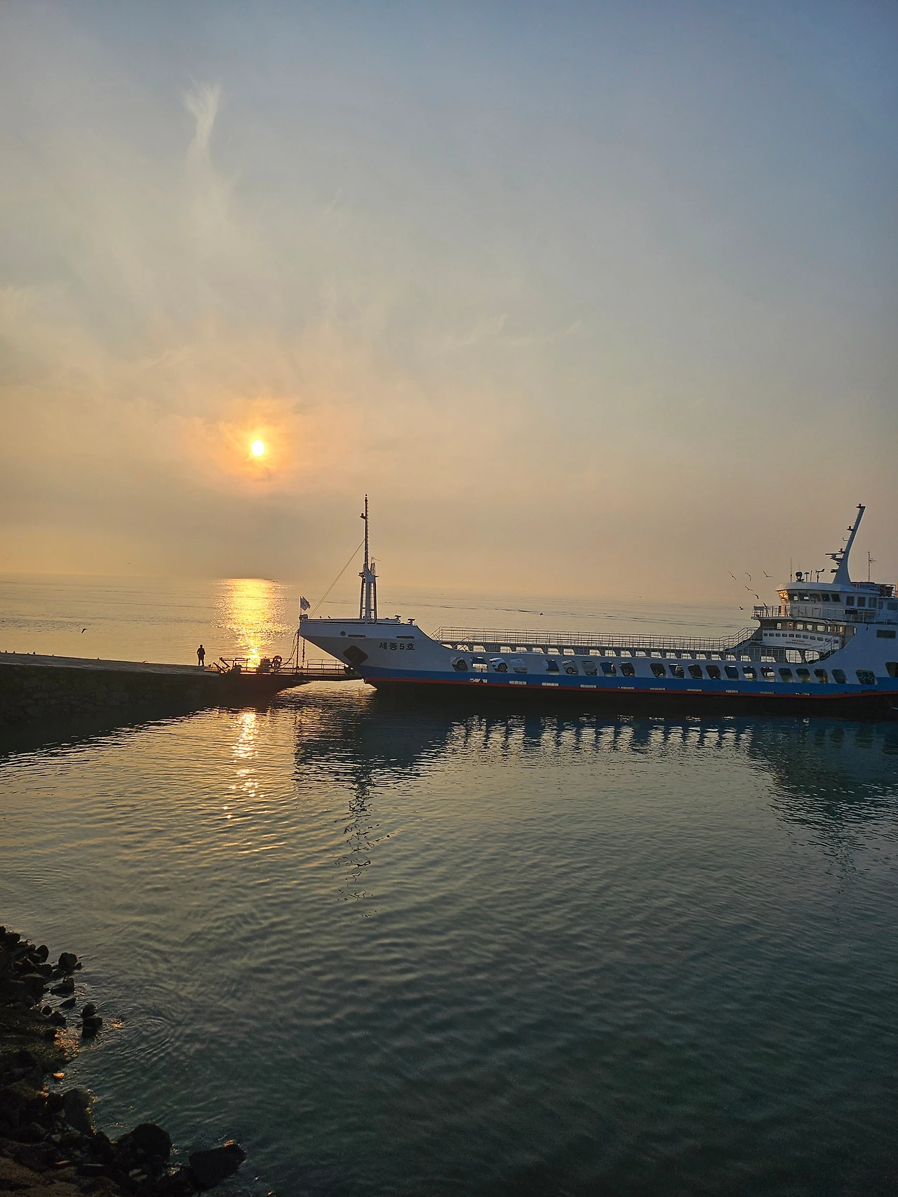 세종호는 선착장을 달려오는 지각생을 기다려주는 호의를 베풀어 이분 늦게 뱃고동 소리를 신호로 닻을 올리고 하얀 치아를 들어내는 물보라를 일으켜 세워 유유히 파도를 가르며 출항하다.