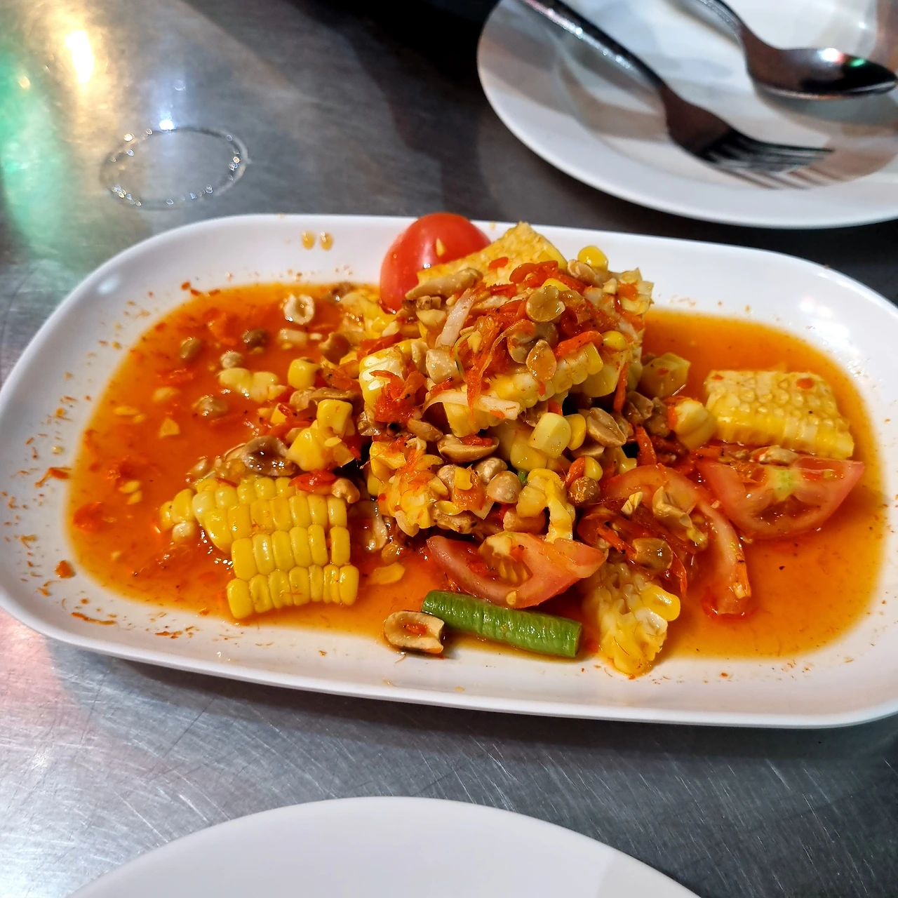 랍 우본_옥수수 쏨땀, 항정살구이, 치킨 반마리이다. 모닝글로리는 너무 당연해 사진도 찍지 않았다.