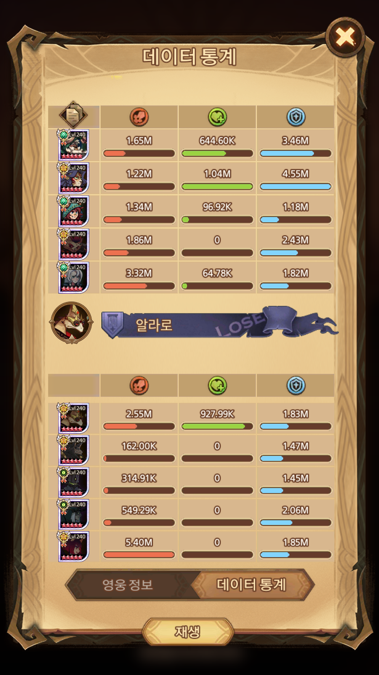 또한, 특정 스테이지에서 전투에 패배한 경우 어떤 캐릭터가 성능을 내지 못했는지 통계표를 출력하여 판단할 수 있습니다. 예를 들어, 딜러가 대미지를 충분히 넣지 못했는지, 탱커가 받은 피해량이 부족한지, 힐러가 회복량이 부족한지 확인할 수 있습니다.